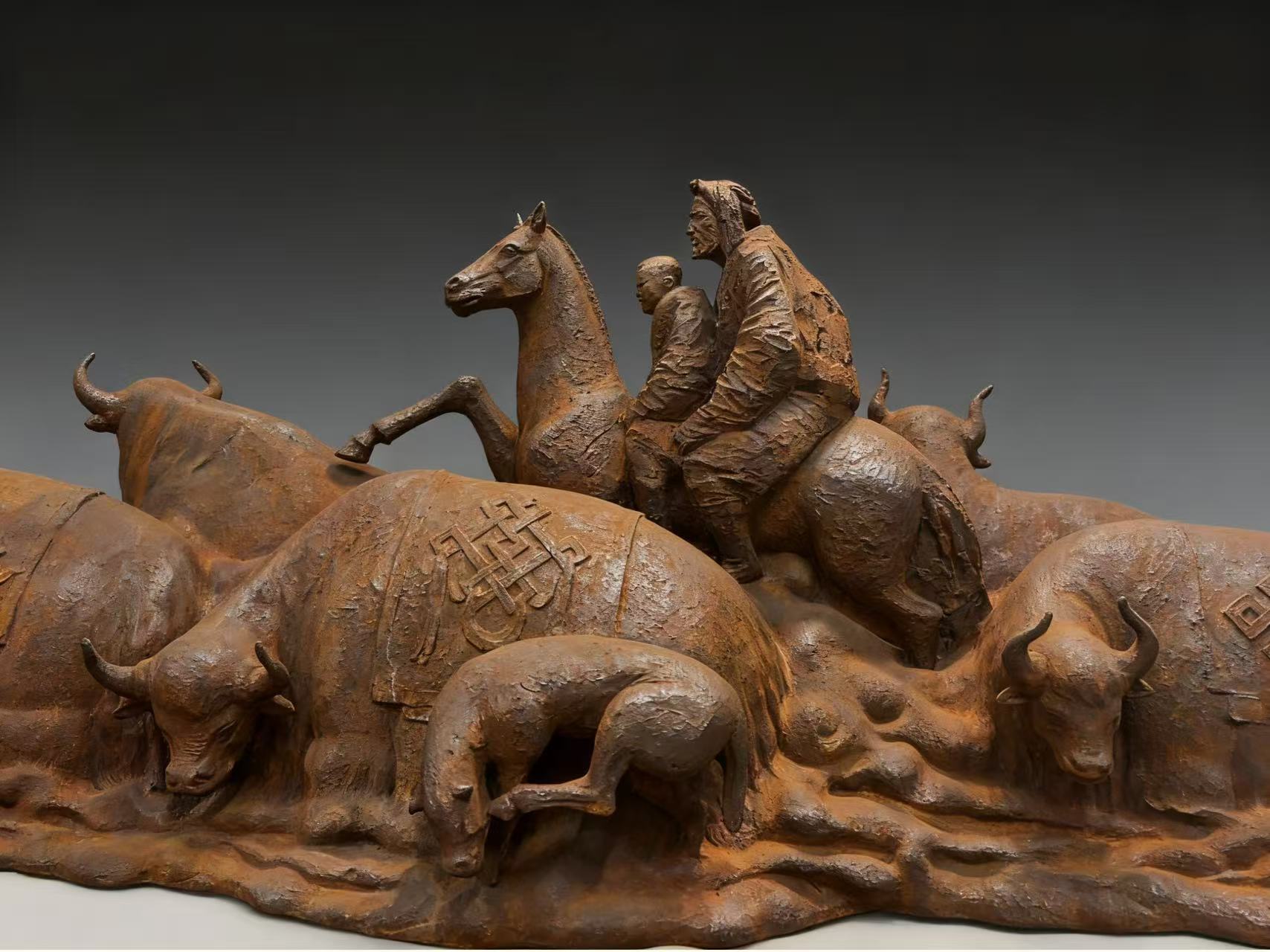 作品以藏族文化符号“吉祥结”为核心元素,将其融入牦牛造型的细节刻画之中,以“牧歌长卷”式的叙事结构,生动展现了游牧生活的绵延诗意与高原生命的澎湃律动。创作者以“牧心”的视角深入牧民的精神世界,在广袤高原的天地之间,呈现人与万物共生共息的本真状态——“万象归原”不仅是自然的回归,更是心灵的安顿。而“天路”的意象为作品注入鲜明的时代印记,在“牧歌”悠远的吟唱中,“盛世犇腾”以蓬勃的生命力象征牦牛群的奋蹄前行,也隐喻着新时代民族地区的发展活力与奋进气象。整件作品将民族文化、自然哲思与时代精神熔铸一体,既有历史的厚重积淀,更涌动着生生不息的时代力量。