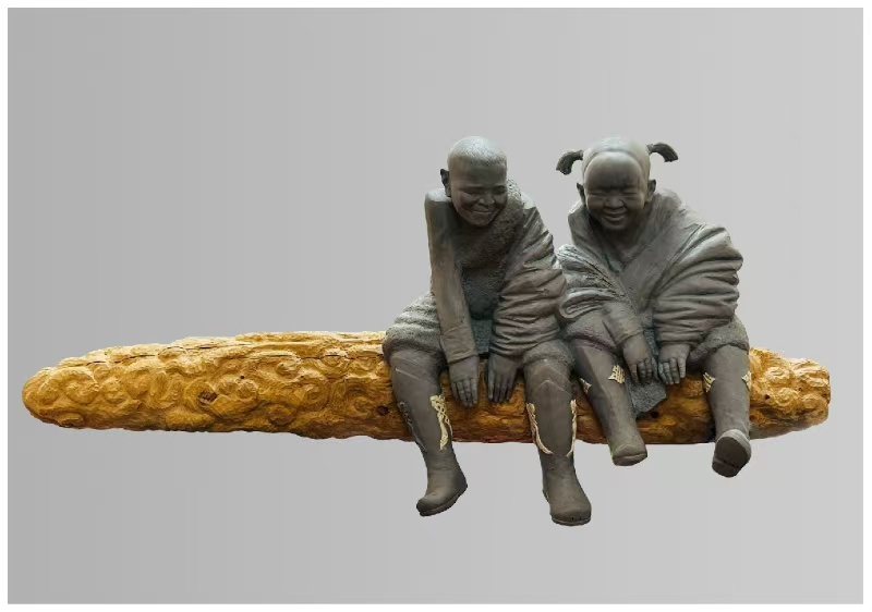 “云枝”呼应木雕底座的云纹肌理,“笑语”捕捉孩童的天真神态,将材质的古朴与生命的鲜活交融,传递出时光里的纯真暖意,同时体现藏族生活的崭新面貌生活状态。
