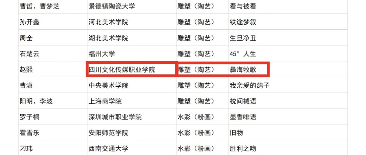 近日,第十七届中国高校美术作品学年展获奖与入选名单正式公布,四川文化传媒职业学院教师在全国高校高水平艺术赛事中脱颖而出。