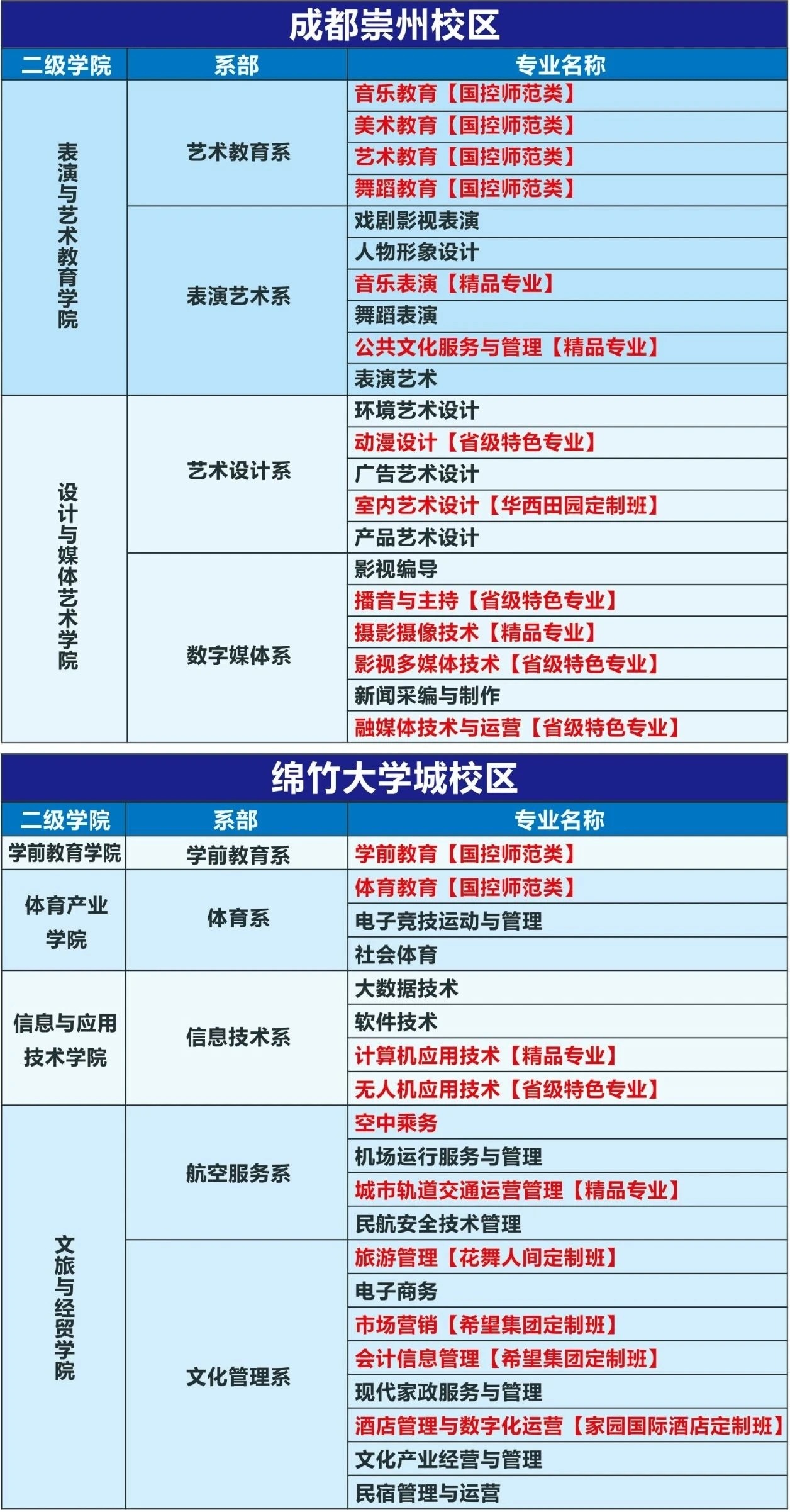 现设有43个专业,根据四川省、成都市经济社会和文化产业发展规划,主动适应文化产业的发展和转型需求,逐步优化专业结构,坚持以“服务区域经济文化发展”为根本、以“文化服务和文化教育”为主体、以“媒体艺术与媒体技术”为支撑的“12257”专业建设思路。着力构建广播影视、文化教育、艺术设计、表演艺术、航空服务五大特色专业群,重点打造影视多媒体技术、摄影摄像技术、学前教育、动漫设计、广告设计与制作、公共文化服务与管理、无人机应用技术七个核心专业。