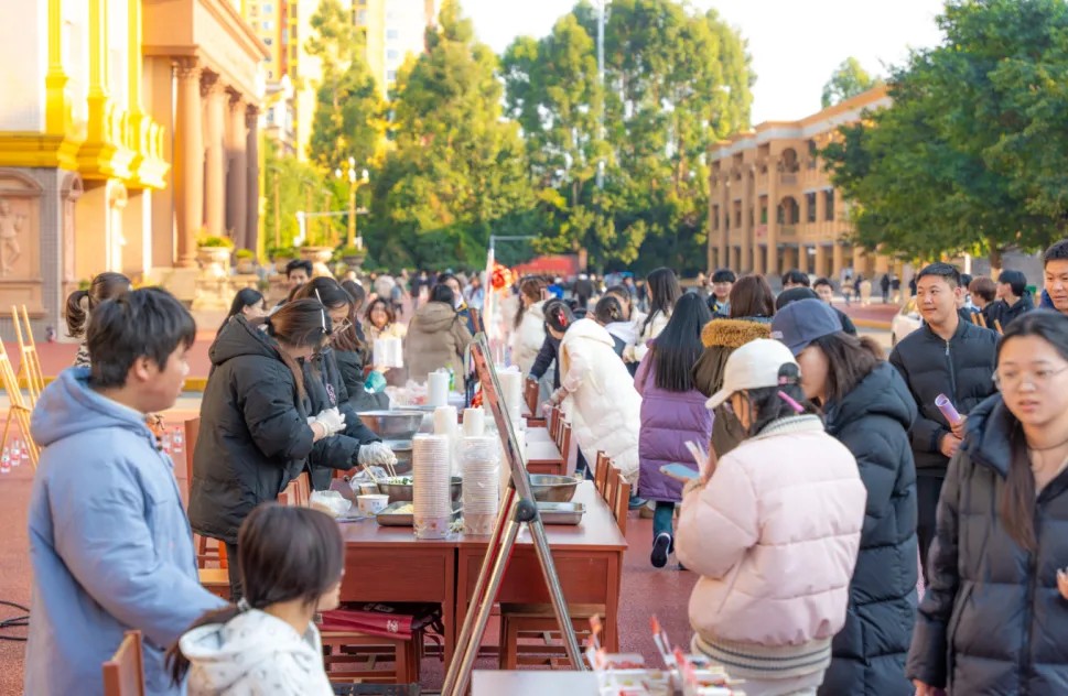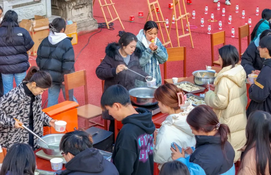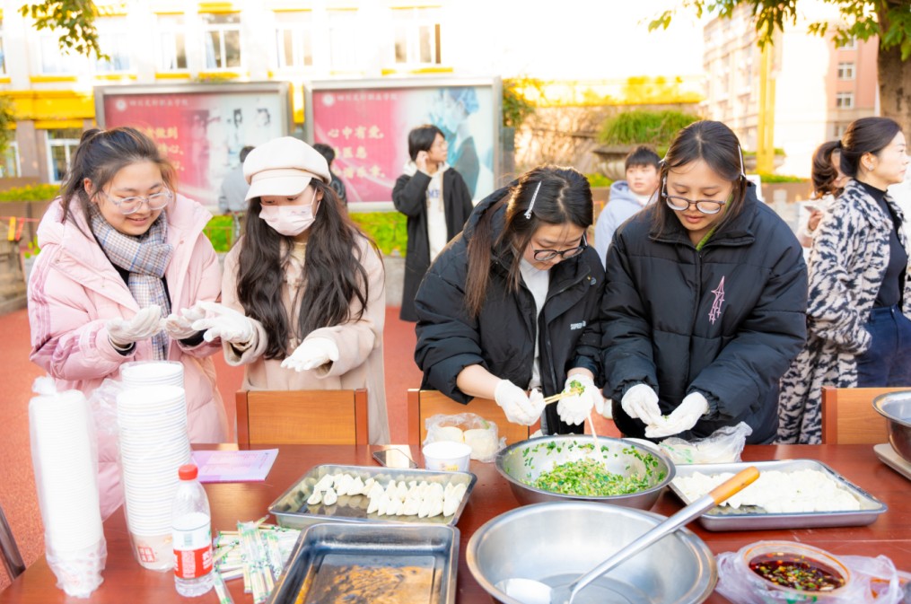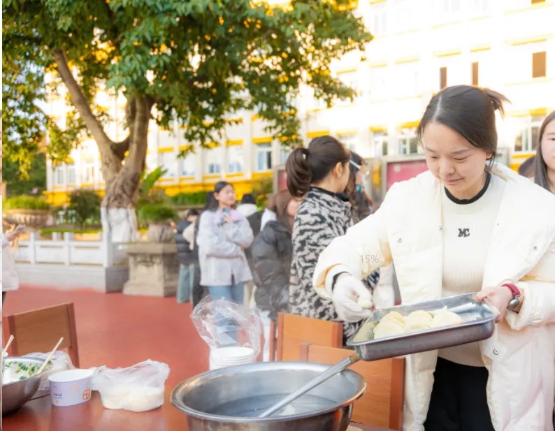 随着喜庆的音乐声起,浓郁的节日氛围便扑面而来,区域板块各自精彩纷呈,共同构成了这场传统文化与现代校园生活完美融合的盛宴,俨然成为了一个传递新春祝福、体验传统文化的温馨殿堂。在包饺子环节中,同学们热情高涨,个个摩拳擦掌,准备大显身手。不一会,各式各样的饺子便摆满了盘子,形态各异,大家一边包着饺子,一边畅所欲言,分享生活中的点滴趣事、难忘经历。