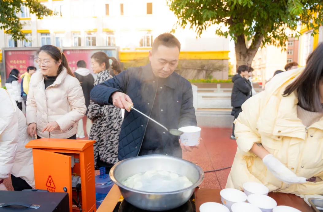 在大家的共同努力下,一盘盘皮薄馅大的饺子新鲜出炉,校领导亲切的为同学们送上热气腾腾的饺子,气氛热闹而温馨,冲淡了许多思乡的愁绪,大家围坐在一起,你一言我一语,分享着饺子的美味,细细品味着劳动带来的喜悦。