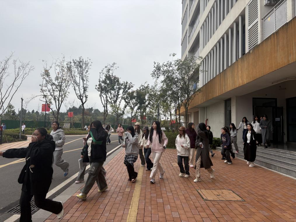本次演练首次启用消防联动控制系统,演练模拟学生公寓及食堂发生火情,宿管人员迅速触发应急报警装置后,消防广播启动声光报警系统,所有建筑强制断电,应急照明、送风机、排烟机启动,电梯紧急迫降1层。与此同时各楼层疏导人员立即组织学生沿预定路线有序撤离。整个过程紧张有序、响应迅速,全体师生在规定时间内安全撤离至指定集结区域。疏散结束后,各二级学院及时清点人数并将疏散情况上报总指挥,确保现场无人员遗漏,整个过程充分展现了我校师生们良好的应急素养和纪律意识。