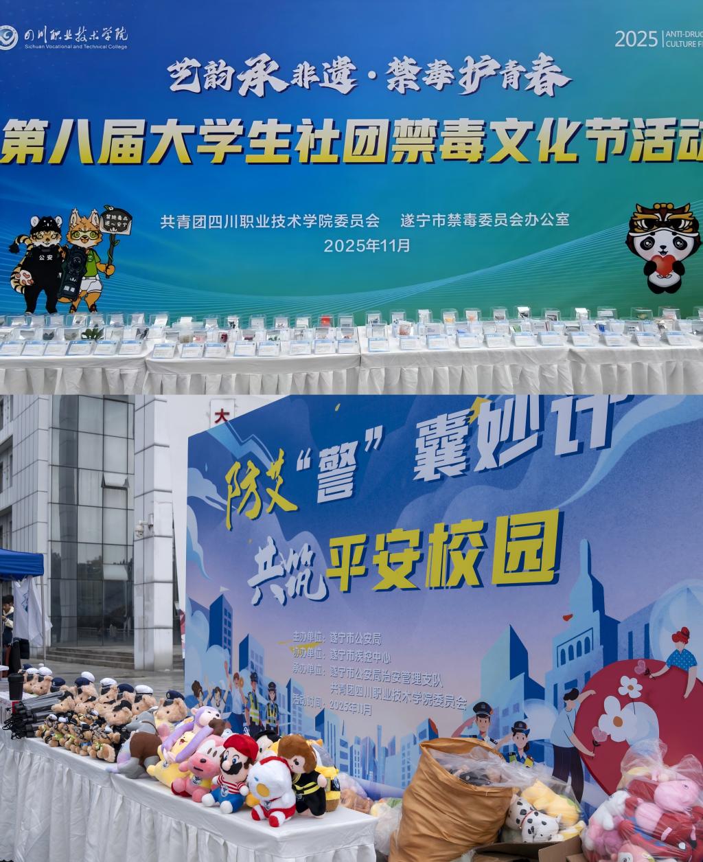 活动现场,遂宁市禁毒办与公安局的工作人员全程参与指导,现场设置仿真毒品展示区,通过实物模型直观呈现传统毒品与新型伪装毒品的外观特征,打破学生对“毒品”的认知误区,18个学生社团结合自身特色打造了各具亮点的宣传阵地,共同形成了一条集知识性、趣味性、互动性于一体的禁毒防艾文化街区,通过沉浸式体验、互动问答、趣味游戏等形式,在轻松氛围中筑牢健康防护屏障,引导青年学子树立“珍爱生命、远离毒艾”的坚定信念。