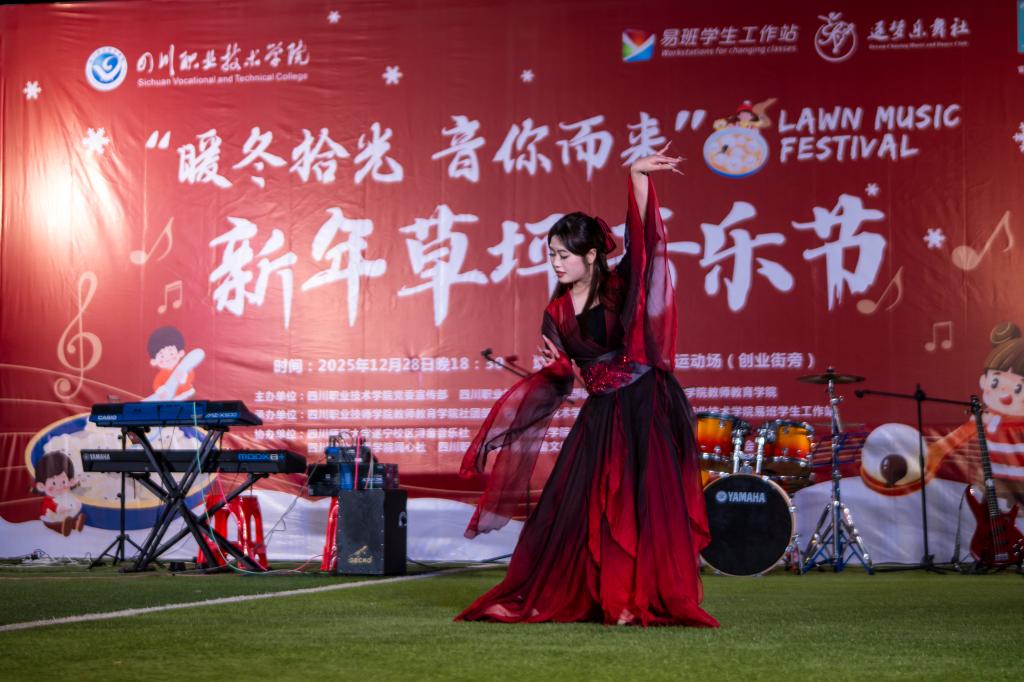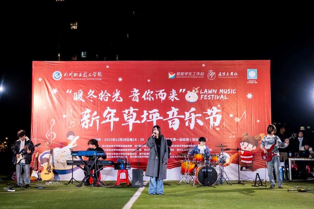 18时30分,新年草坪音乐节火热开启。本次音乐节特邀四川师范大学遂宁校区、遂宁能源职业学院的社团与我校各学生社团同台演出,涵盖乐队演奏、歌曲演唱、舞蹈表演、汉服走秀等多种艺术形式。三校学子齐聚草坪,以音乐为纽带,展现青春风采,传递新年祝福,现场氛围热烈而融洽。
