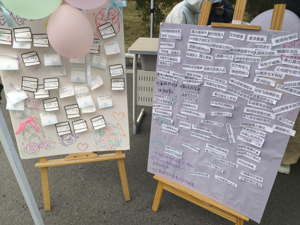 活动现场,同学们发挥奇思妙想,将零散诗句拼成意境流畅的小诗,在便签纸上写下对自己或身边女性的祝福与期许,以文字插画传递温暖、展现女性力量。展示板上很快贴满鼓励话语,同学们在创作与分享中收获乐趣,更在彼此文字里感受温暖与鼓舞。