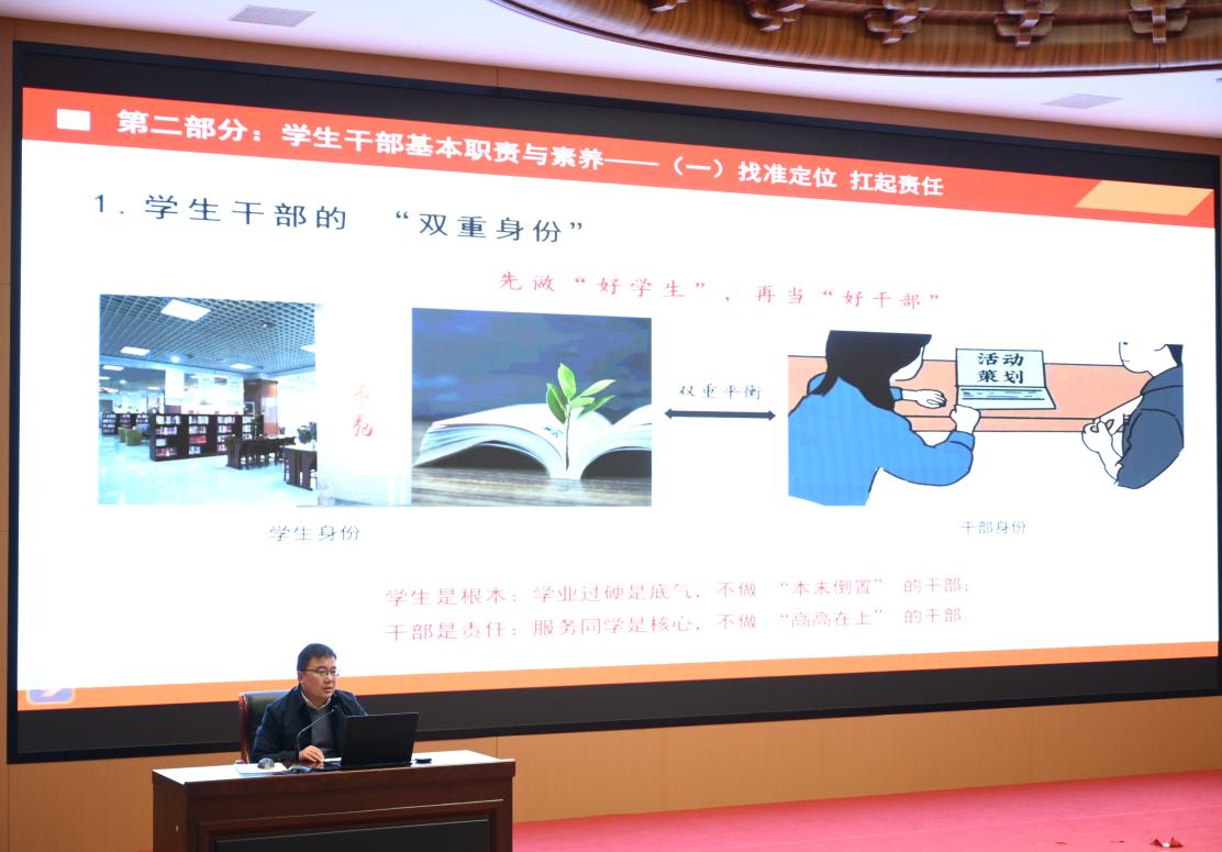 为深入学习贯彻党的二十届四中全会精神,切实加强学生干部队伍建设,提升学生骨干的综合素质与履职能力,2026年1月15日,学生工作处在教师发展中心组织开展了2026年第一期学生干部培训。本次培训以“淬炼青春担当,赋能成长领航”为主题,由学生工作处负责人主讲,校系两级学生组织骨干180余人参加。