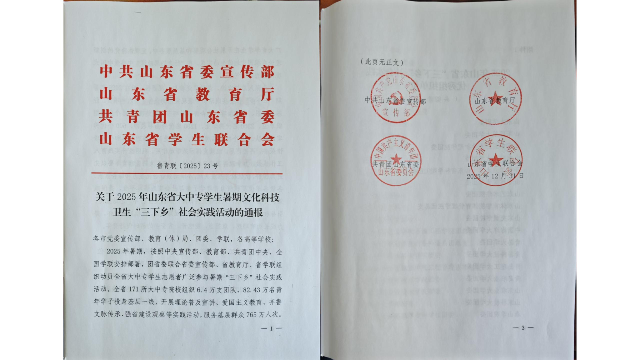 2026年1月,由中共山东省委宣传部、山东省教育厅、共青团山东省委、山东省学生联合会共同组织的2025年山东省大中专学生志愿者暑期“三下乡”社会实践活动评选结果正式揭晓,学校在此次活动中表现突出,荣获多项省级荣誉,充分彰显了学校在实践育人工作方面的显著成效。
