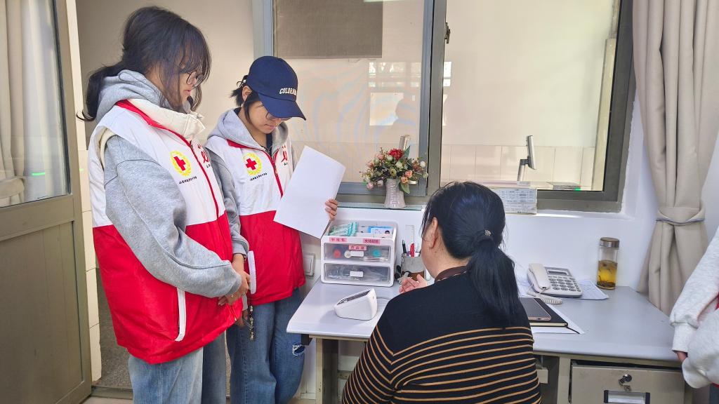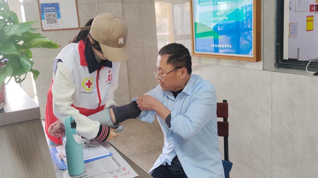 近日,学校红十字会组织学生志愿者深入三个宿舍区,开展以“暖心行动 致敬守护”为主题的血压测量与知识科普活动,为宿舍区后勤工作人员进行血压测量公益服务。