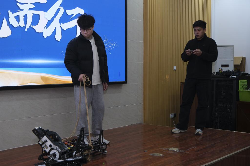 在“机甲秀场”环节,战队成员唐申宇操控机器人进行精准抓取与灵活避障。在他的指导下,现场同学走上前台,亲手尝试操控机器人完成移动等基础任务。当指令转化为机器人的实体动作时,同学们的脸上洋溢着新奇与成就感。
