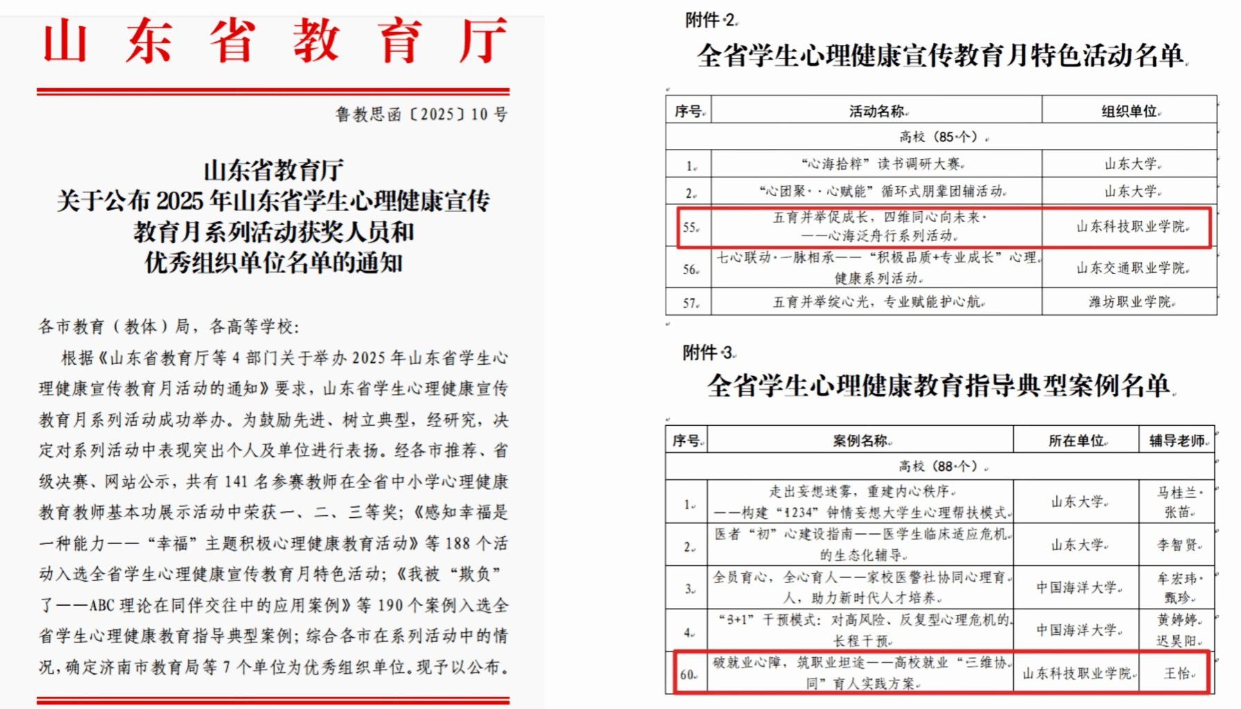 近日,山东省教育厅发布《关于公布2025年山东省学生心理健康宣传教育月系列活动获奖人员和优秀组织单位名单的通知》(鲁教思函〔2025〕10号)。我校师生表现出色,共有2项作品获奖,充分体现了学校在学生心理健康教育及心理学学科育人方面的扎实工作和显著成效。