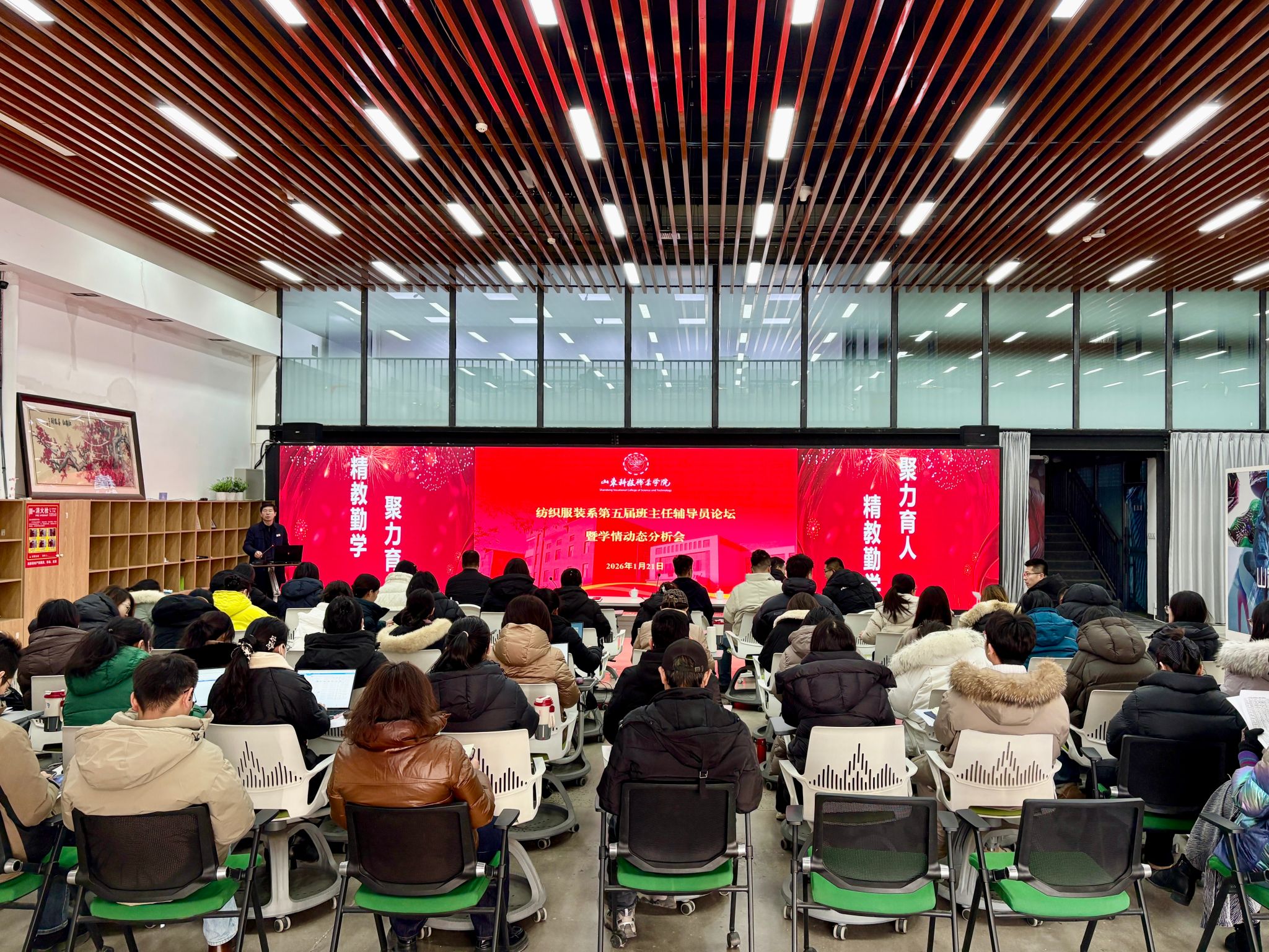 1月21日下午,纺织服装系第五届班主任辅导员论坛暨年度学情动态分析会在霓裳园陈列大厅顺利召开。会议邀请安全保卫处、学生工作处(武装部)相关同志出席,纺织服装系全体教职工参加。本次会议以“夯实育人根基、提升育人质效”为主题,围绕安全管理、学情分析、班级建设、工作质效等重点工作开展深度研讨,旨在凝聚全员、全过程育人共识,明确新阶段工作方向,为系部人才培养工作提质增效奠定坚实基础。系党总支书记丁仕福主持会议。