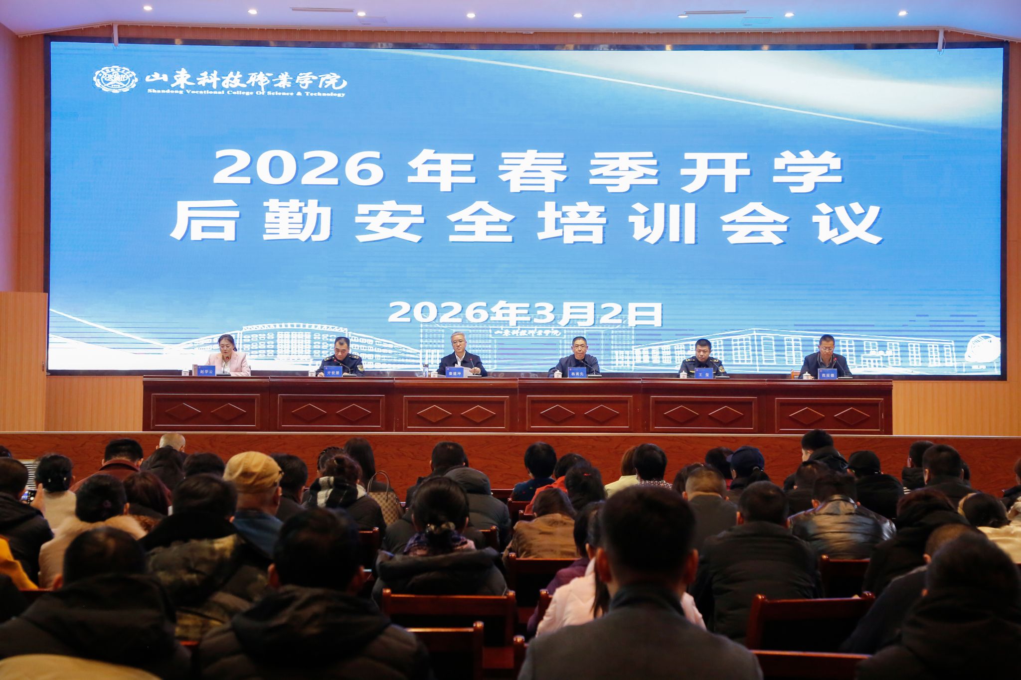 3月2日,学校2026年后勤服务管理处春季开学安全培训会在南院报告厅举行。学校党委副书记秦建坤、潍城区市场监督管理局党组成员亓世朋出席并讲话,望留市场监管所所长王玺一行到会指导。后勤服务管理处党政负责人、各餐饮劳务服务公司管理及从业人员、食堂原材料供应商、校内配送人员及后勤全体工作人员共300余人参训。