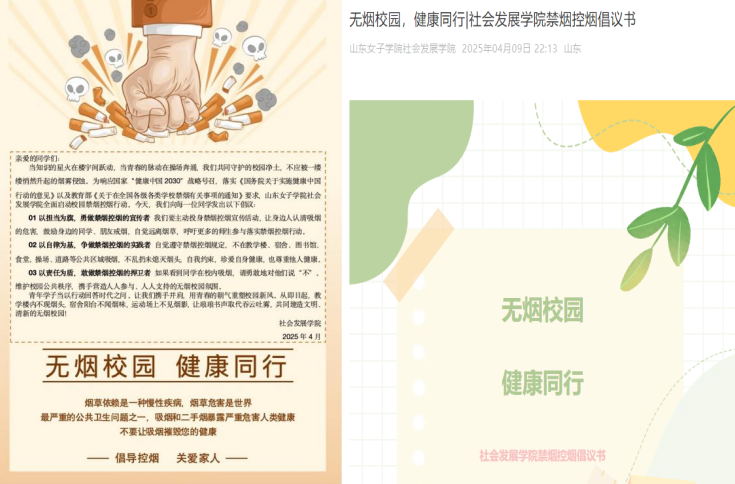 为扩大宣传范围,强化宣传效果,学院充分利用新媒体传播平台,发布推文,倡议书呼吁同学们以担当为旗,勇做禁烟控烟的宣传者;以自律为基,争做禁烟控烟的实践者;以责任为盾,敢做禁烟控烟的捍卫者,用青春的朝气重塑校园新风,共同建造文明、清新的无烟校园!