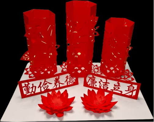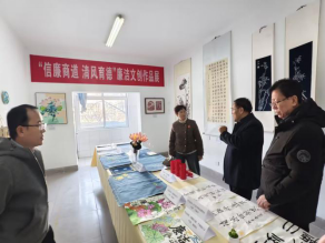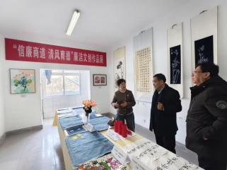 本次展览立足商贸专业,聚焦“廉洁”主题,集中展示了师生创作的剪纸、书法、绘画、非遗手作等一系列文创作品。这些作品将专业特色、艺术表达与廉洁内涵相融合,于细微处见精神,生动诠释了崇廉尚洁的价值理念,为思政教育提供了具象化、沉浸式的育人载体。张汉国书记从廉洁文化主题的凝练,到展品质量、布展构思给与评价和指导。肯定“信廉商道”融合专业特点的教育品牌,对系部廉洁文化建设和浸润式、走向教育表示赞赏。