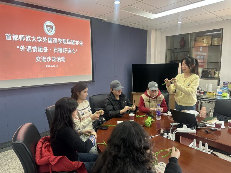 为促进各民族学生之间的情感交融与文化认同,铸牢中华民族共同体意识,12月3日,“语你相伴”外国语学院“一站式”学生社区在外语楼613会议室 举办“外语情暖冬·石榴籽连心” 民族学生交流沙龙活动。学院党委书记刘营、学校学生工作部(处)副部长(挂职)乃比江·麦图荪、辅导员玉苏甫江·买买提依明及学院学生代表参与活动。活动由学院党委副书记王亚楠主持。