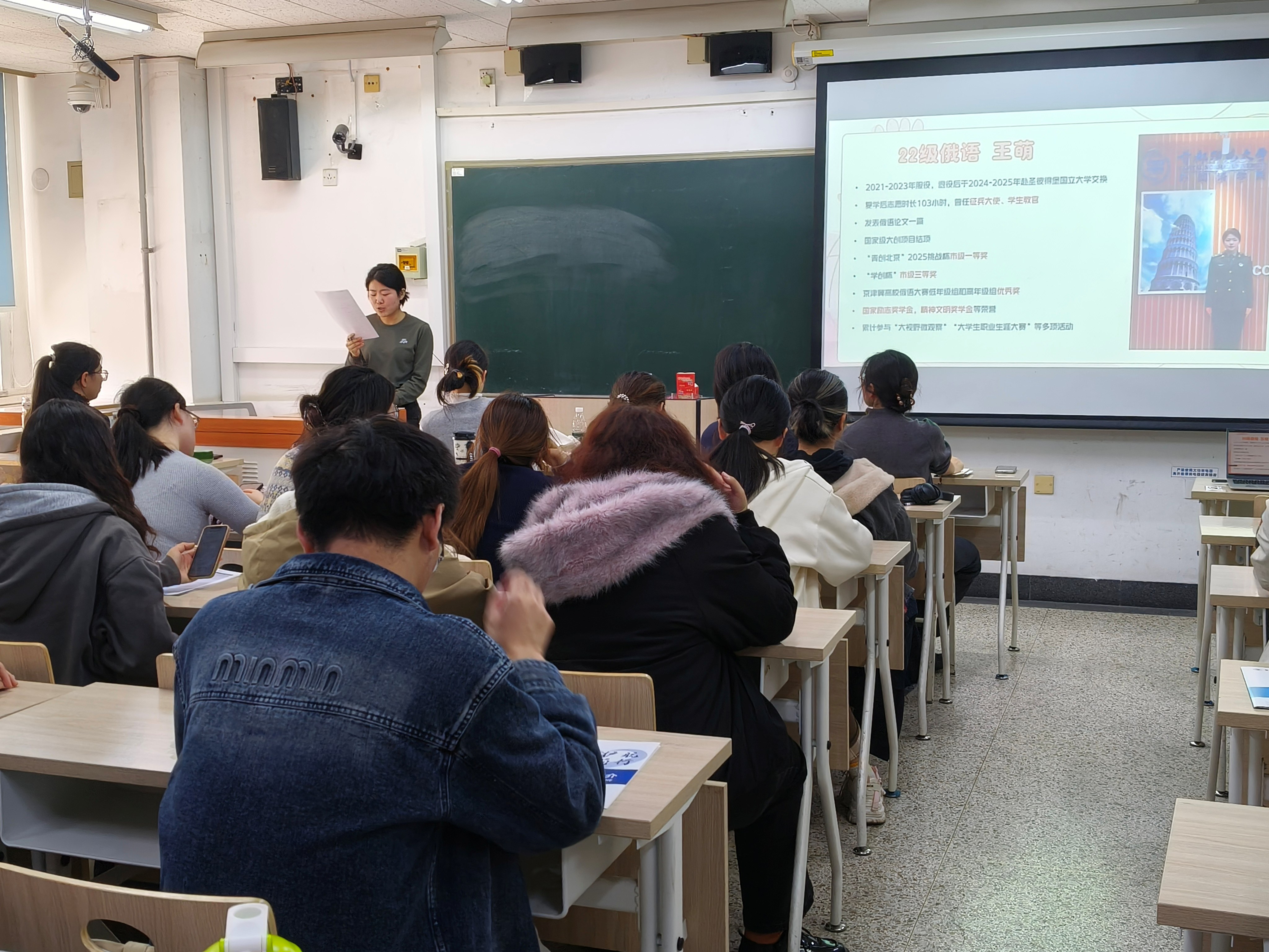 2024级英语专业谷文静(第六届校“学生资助宣传大使”寒假社会实践优秀奖获得者),细致分享资助宣传培训经历,为同学们提供宝贵实践经验;2022级俄语专业优秀退伍大学生士兵王萌结合丰富竞赛经历,从团队构建、项目执行维度分享实用技巧,鼓励同学们积极参与竞赛、锻炼成长。