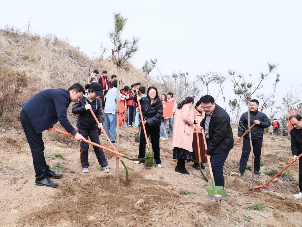 下午3时,党委书记王维等学院领导和师生一道,手持铁锹,在春风中挥洒汗水,为校园再添生机。植树活动在园林实训场东侧和太公湖北山南坡两个场地同步开展。师生们热情高涨,分工明确,挥锹挖坑、扶树正苗、培土踩实、浇水定根,整个校园洋溢着团结协作、积极向上的氛围。经过师生们齐心协力的辛勤劳作,共栽植梧桐、黑松、金银花、玫瑰花4个品种总计170余株。