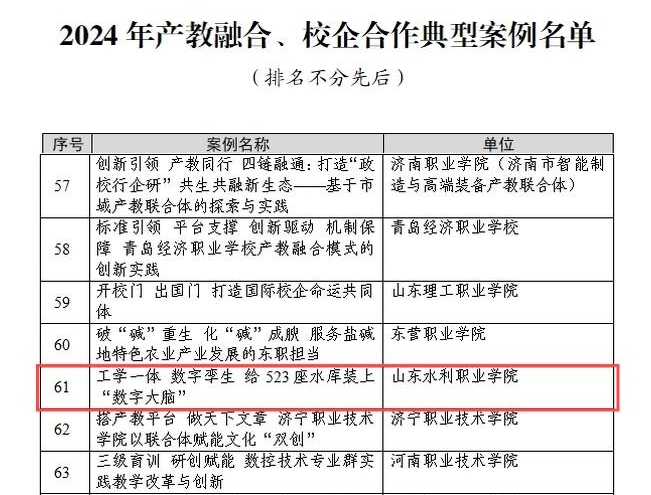 近日,教育部公布了2024年产教融合、校企合作典型案例名单的通知,学院《工学一体 数字孪生 给523座水库装上“数字大脑”》案例成功入选。