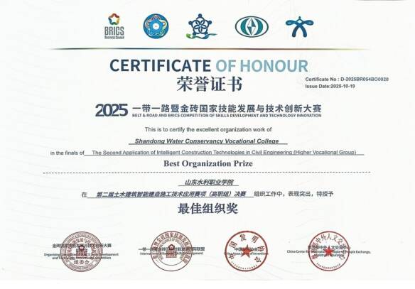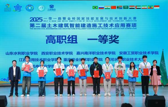 近日,2025年“一带一路”暨金砖国家技能发展与技术创新大赛——第二届土木建筑智能建造施工技术应用赛项决赛在重庆安全技术职业学院举行。本次赛事汇聚全国28个省、自治区、直辖市近300所职业院校的顶尖队伍同台竞技,竞争激烈,盛况空前。经过多轮高强度比拼,学院周忠君、李子扬两位同学凭借扎实的专业功底、出色的实践能力与稳定的临场发挥,一举斩获高职组一等奖第一名的优异成绩。同时,学院荣获“最佳组织奖”,指导教师高磊、邵慧被授予“优秀指导教师”称号。