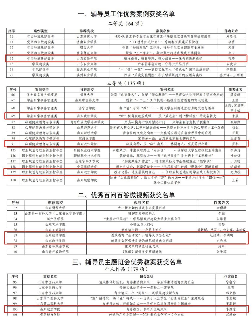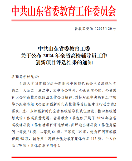 近日,中共山东省委教育工委公布“2024年全省高校辅导员工作创新项目”评选结果,我校共获7个奖项,包括辅导员工作优秀案例二等奖1项、三等奖3项,优秀百问百答微视频2项,辅导员主题班会优秀教案个人作品奖1项。