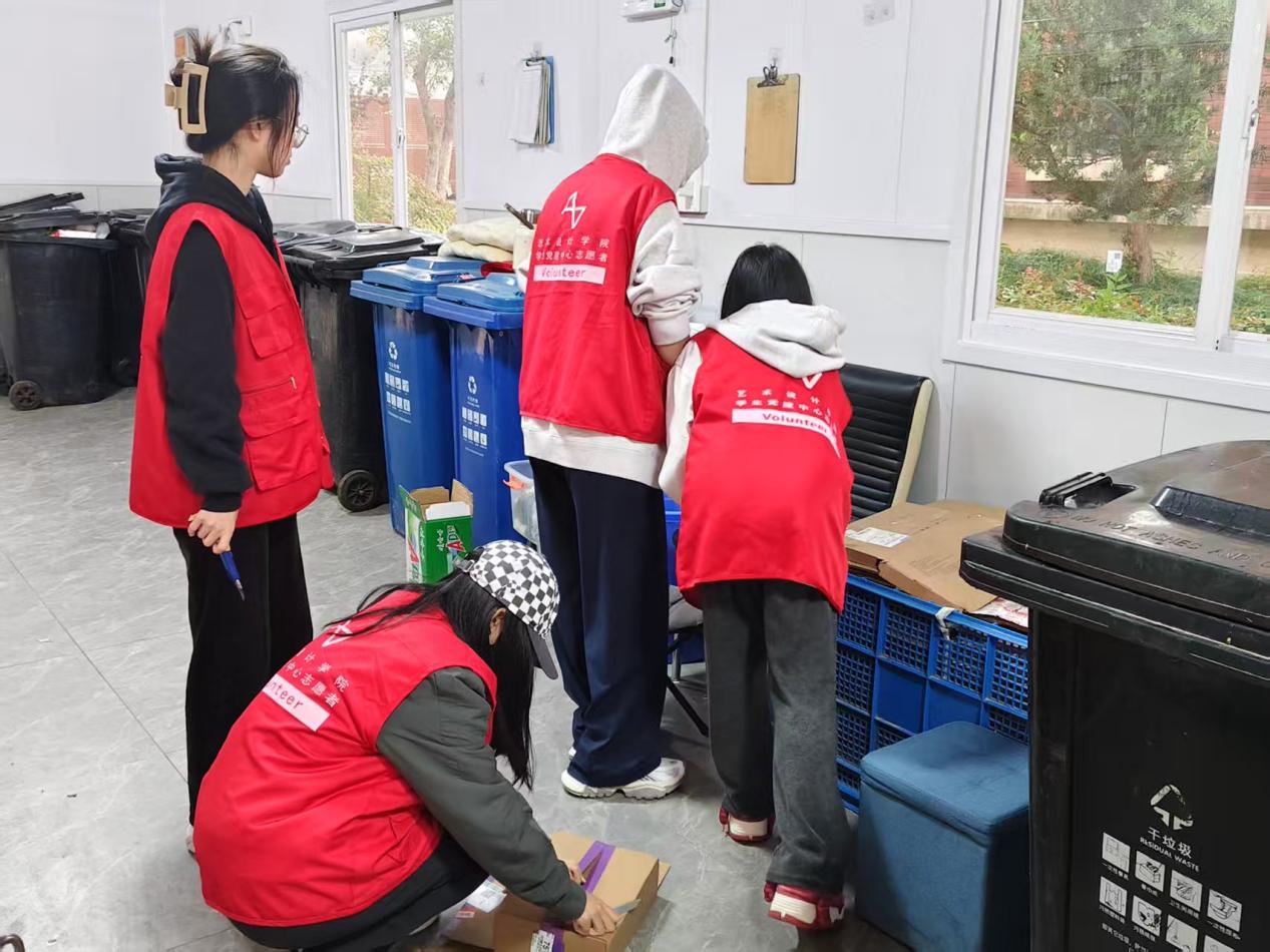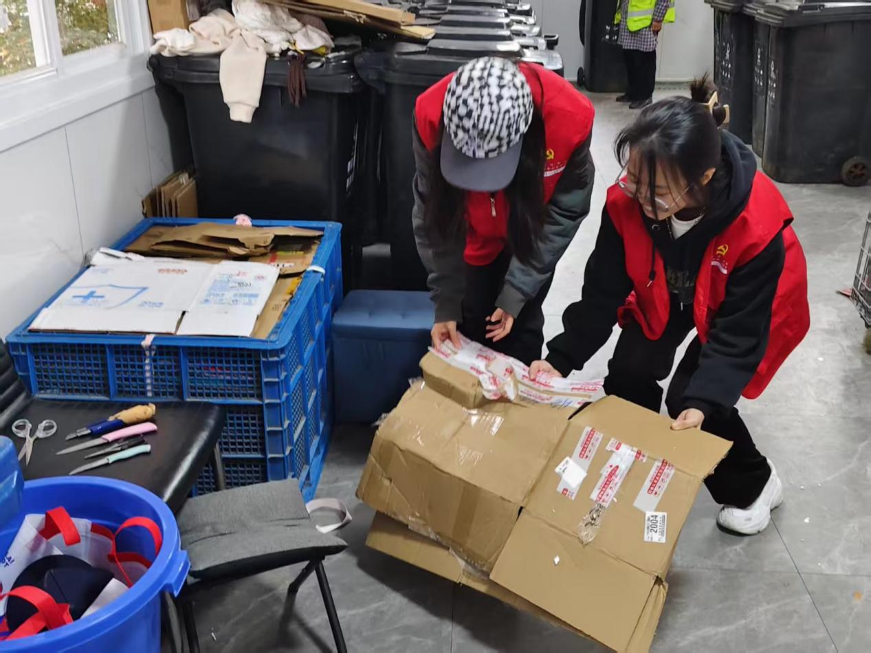 与此同时,南区女寝垃圾站的志愿服务也有序推进。红色服务队队员协助保洁阿姨拆解快递盒、分拣混投垃圾:用剪刀剥离纸箱上的胶带,将其压平叠放以节省空间;对照分类标准,将厨余垃圾、可回收物、有害垃圾精准归类;遇到有同学投放垃圾,还主动讲解分类知识,引导正确投放。“以前总觉得分类麻烦,亲手操作后才知道,规范分类能让资源更好循环。”参与分拣的队员说,看到原本杂乱的垃圾站变得整齐,成就感十足。