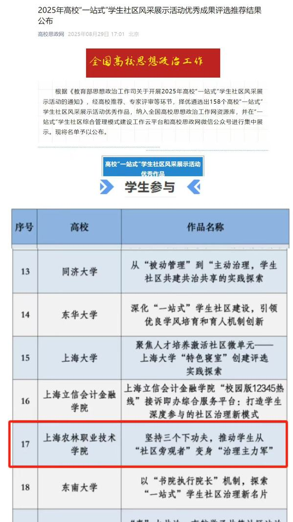 上海农林职业技术学院:“一站式”学生社区建设案例获评教育部2025年优秀成果
