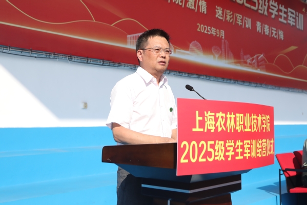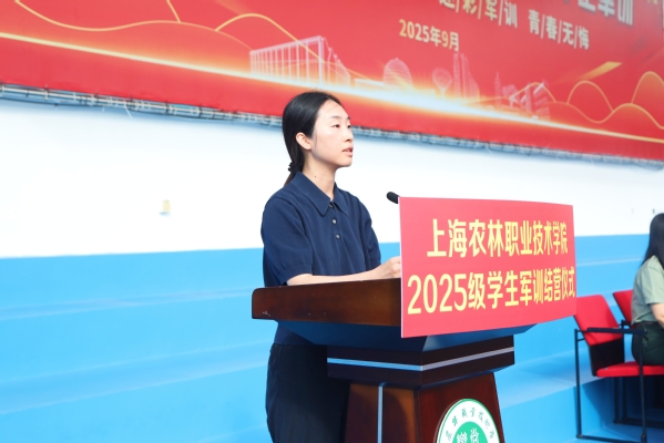 蔡红讲话。他代表学院,向大力支持学院国防教育事业的武警上海总队机动第二支队全体官兵致以崇高敬意,向参与军训工作的老师、后勤人员表示亲切问候,向顺利完成军训任务的2025级全体同学表示热烈祝贺。并向同学们提出四点期望:一是以军训态度守“初心”。要将“学好技能、服务农业”的信念落实于行动,像军训一样恪守纪律、严谨务实,把一丝不苟的态度融入每一门课程、每一次实验和每一个细节,踏实坚守为农服务的初心。二是以扎根精神怀“农心”。上海的都市现代农业是服务超大城市运转、守护国家粮食安全、点亮人民美好生活的“国之大者”。要常怀一颗敬畏土地、服务社会的农心,主动将个人理想融入上海农业发展与国家乡村振兴大局。三是以精益求精炼“匠心”。军训中每一个动作反复锤炼直至标准,正体现了追求极致的匠心。未来无论是完成一次精准检测,还是设计一份园林方案,都需如此潜心钻研、打磨技能,努力做到既“会操作”,更“懂原理”“能创新”。四是以坚韧毅力成“匠才”。面对今后学习生活中的困难,要回想军训中烈日风雨下的坚持,把淬炼出的意志转化为解决实际问题的能力,从一名“掌握技能”的学生成长为服务农业强国建设的“生力军”。