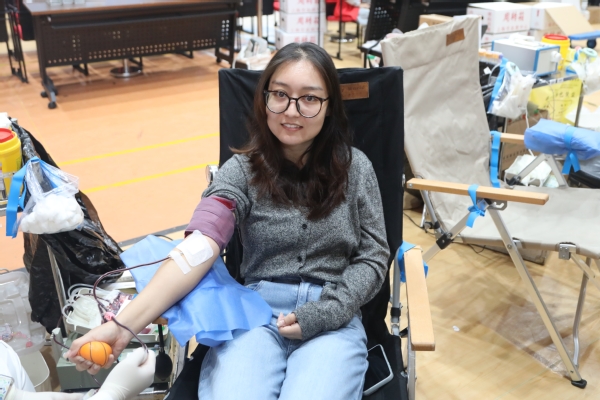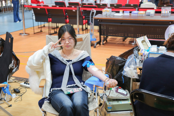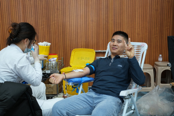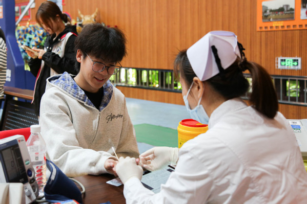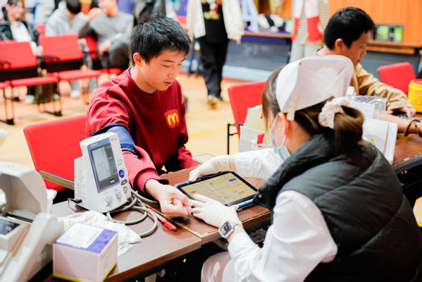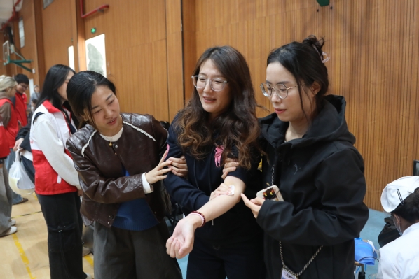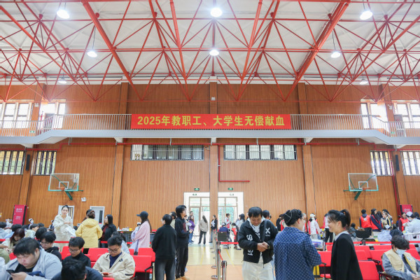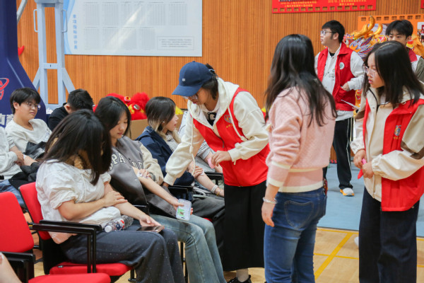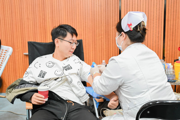 献血活动过程中,体育馆内秩序井然、暖意融融。场地清晰划分等候区、体检区、献血区、休息区四大功能区域,各区域标识明确、流程顺畅。上午8:30,无偿献血工作准时开始。今年献血首次采用无纸化信息登记,师生们提前扫码完成线上报名,现场在志愿者指引下完成信息核验,无需填写纸质表格,登记效率大幅提升。随后,依次完成健康问询、血压测量、血液化验等前期检查。体检合格后,大家挽起衣袖、从容落座,鲜红的血液顺着导管流入血袋,成为拯救生命的“希望火种”。
