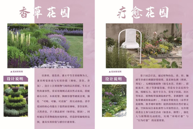 疗愈花园基于园艺疗法理念,通过选用色彩柔和的绣球、鸢尾等植物,结合静坐休憩空间,营造出能舒缓情绪、缓解压力的亲近自然之所,注重营造人与植物的深度互动氛围,实现“自然疗愈”与“行为疗愈”的双重效果。