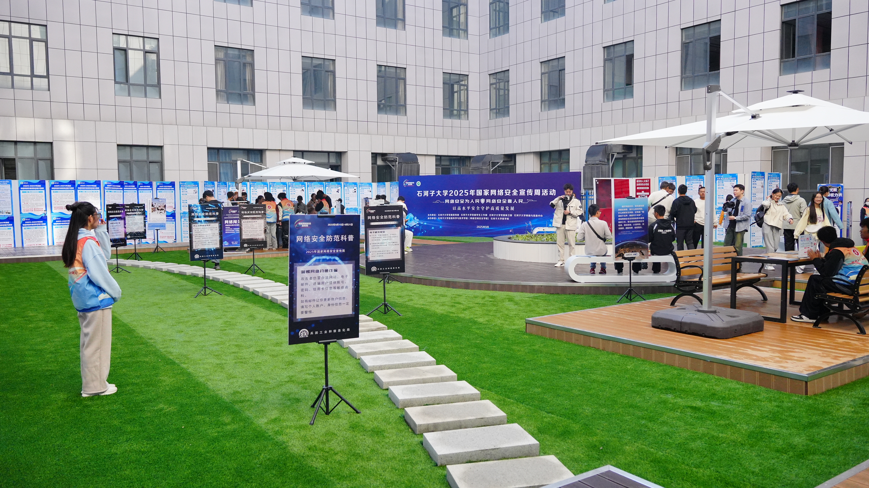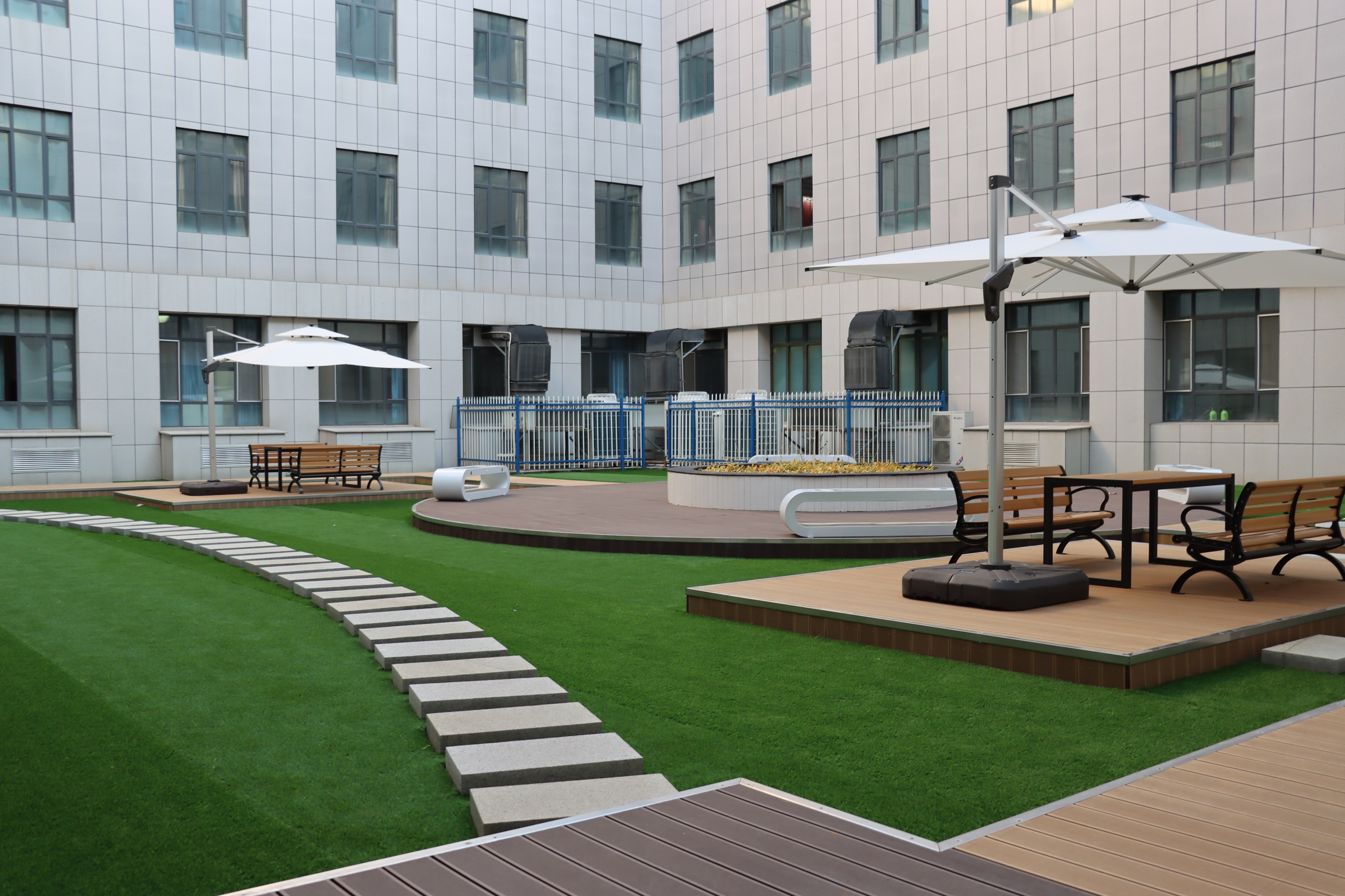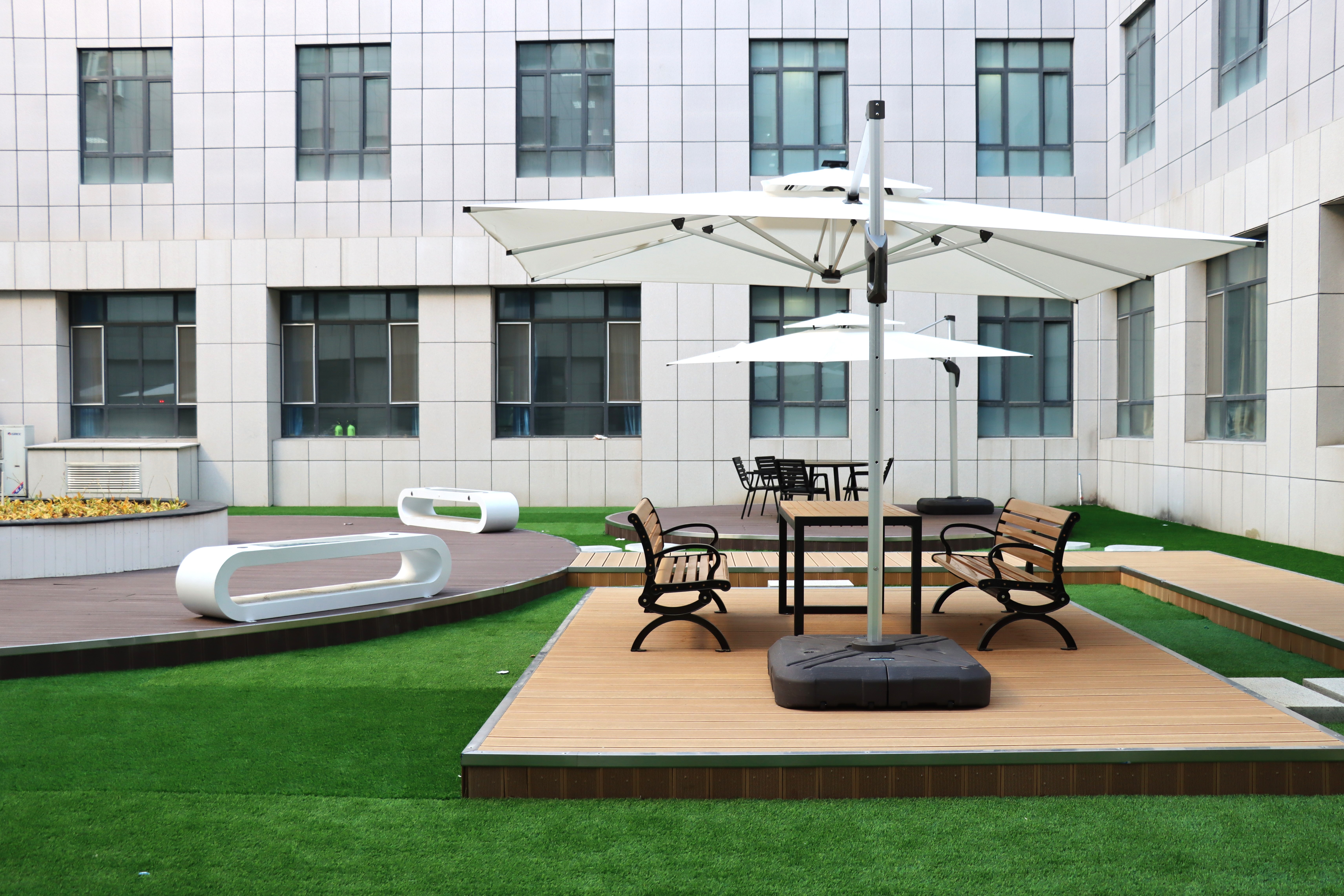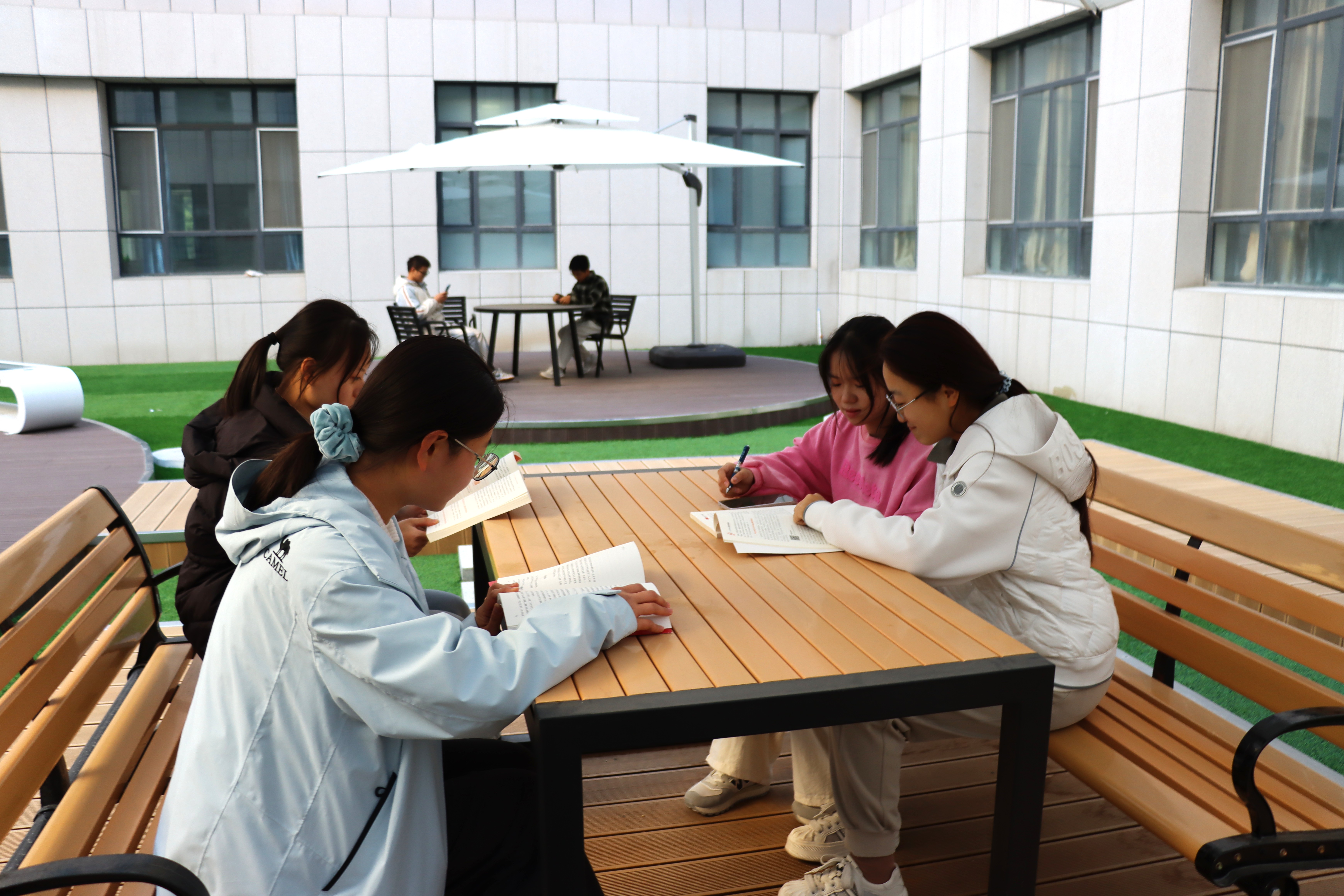 此次改造以服务师生为核心设计理念,地面区域聚焦实用性与舒适性,增设了木桌椅,桌椅设计充分考虑人体工学,弧度贴合身形,让师生久坐讨论、学习也能保持舒适状态,木质栈道形成独特的观景走廊,搭配四季常青的绿植景观为师生营造出亲近自然、放松身心的氛围。尤为贴心的是,空间内特别引入了多组无线充电座椅。无论是课间短暂休息时给手机补电,还是户外临时处理办公文件、查阅学习资料,师生们都能随时享受便捷的充电服务,有效满足了移动办公与灵活学习的需求,让空间的功能性与实用性得到进一步提升。“以前路过天井,总觉得这里空荡荡的,现在改造后,每次经过都忍不住想多停留一会儿。”路过的学生望着焕然一新的空间,忍不住感慨。