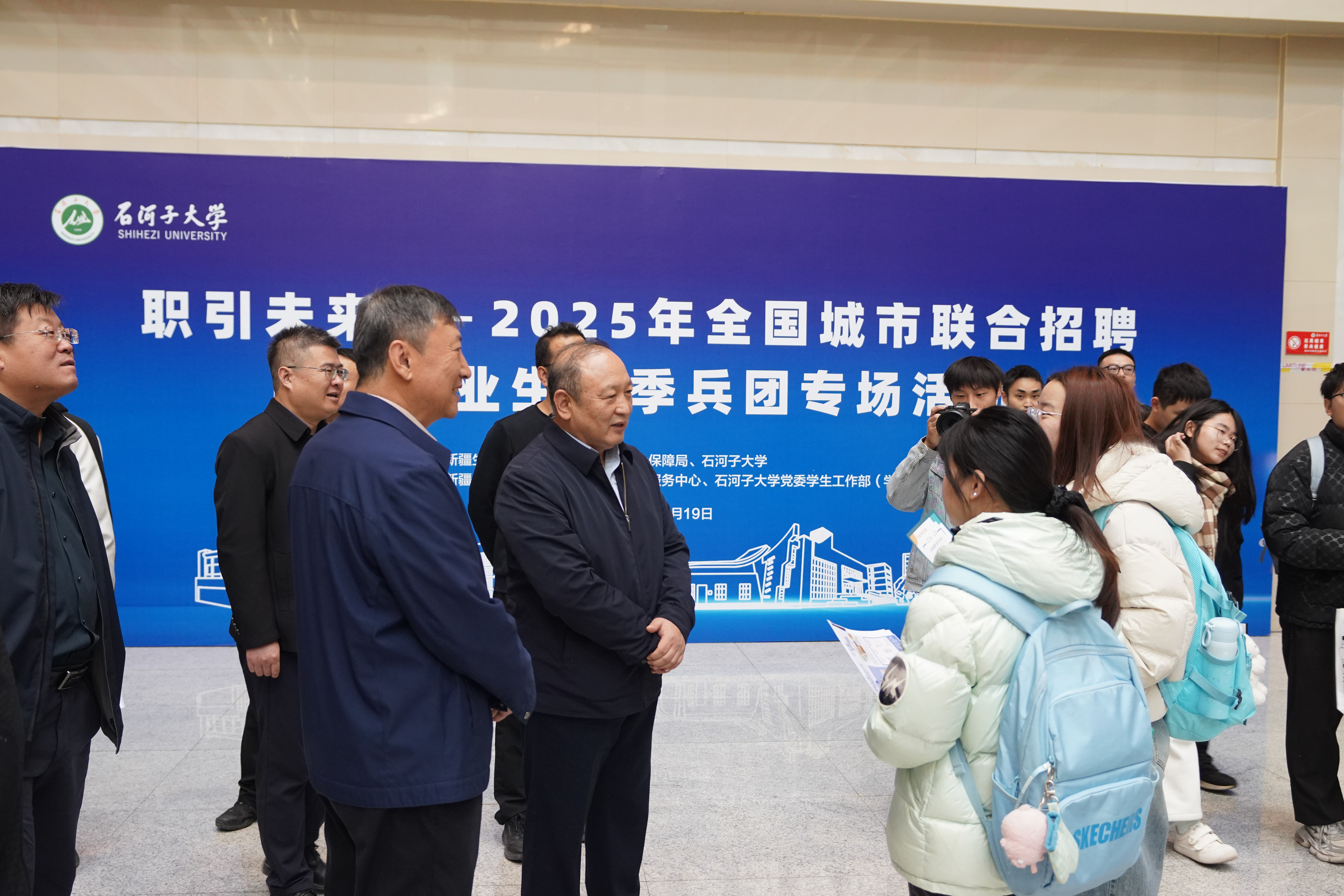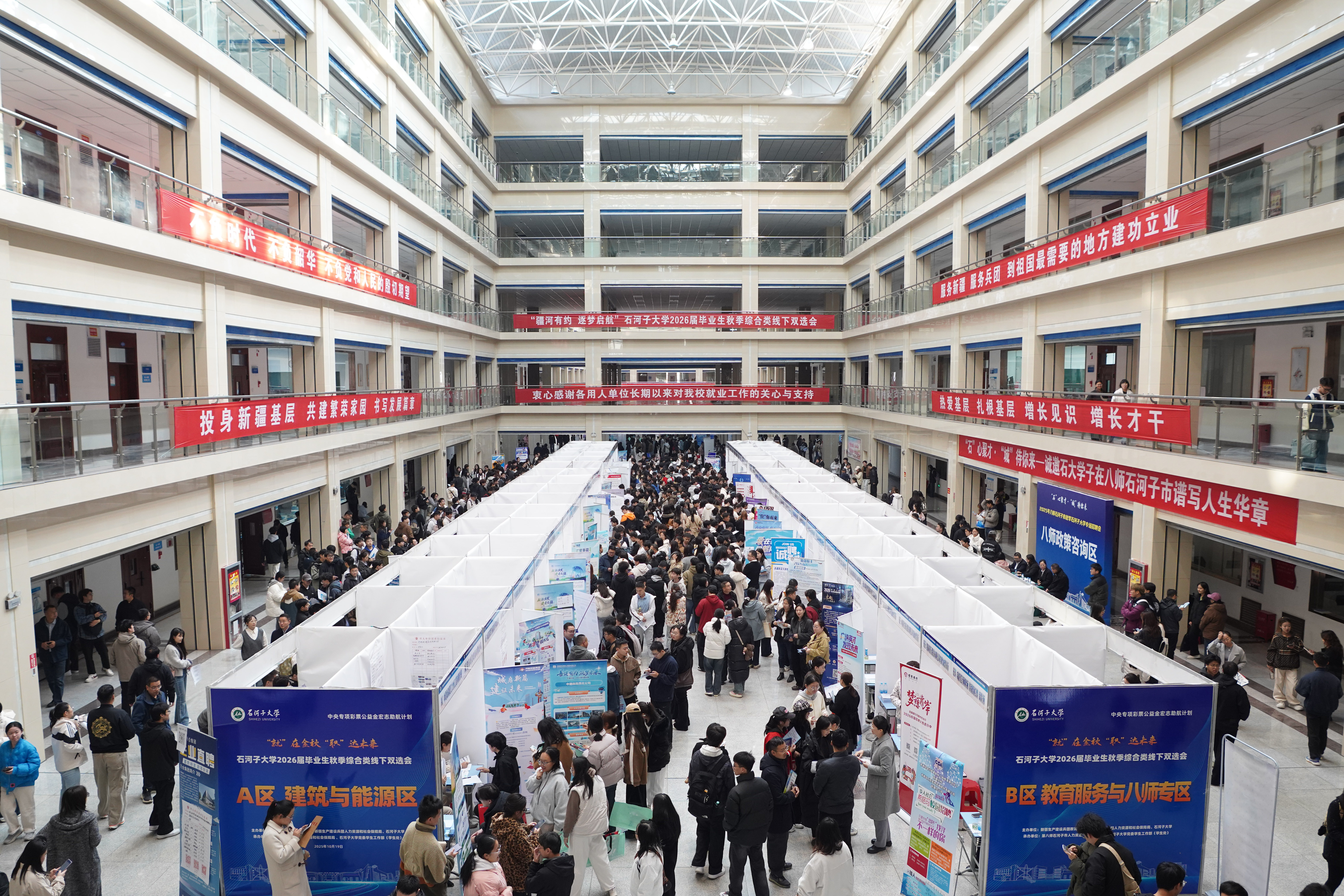 10月19日,“‘就’在金秋 ‘职’达未来” 石河子大学2026届毕业生秋季综合类线下双选会在中区基础实验楼大厅成功举办。石河子大学党委副书记、校长李兆敏,党委常委、副校长李孝光,党委学生工作部(学生处)、各学院分管领导、就业联络员老师共同参与,主动了解企业人才需求,积极推介2026届优秀毕业生。