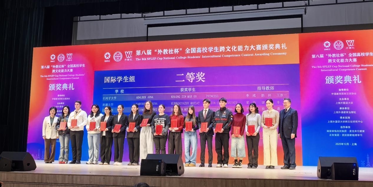 12月14日,第八届“外教社杯”全国高校学生跨文化能力大赛总决赛在上海外国语大学圆满落幕。经过3天的激烈角逐,由我校哈萨克斯坦籍留学生阿尔娜、缅甸籍留学生金灵溪和刘沐琛三人组成的参赛队伍在本次大赛中荣获国际学生组二等奖。
