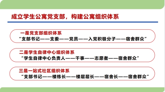 筑牢组织体系。学院构建“党委—党支部—党员/入党积极分子—宿舍”四级联动管理体系,实现党组织在宿舍楼栋的全面覆盖,织密纵向到底、横向到边的组织网络;设立功能岗位。依托学生公寓党支部,整合学生自律中心与楼栋组织功能,设立党员示范岗、志愿服务岗、文明督导岗,推动党员亮身份、作表率;落实精准机制。执行“四级挂靠”工作要求,组织党员定点联系楼栋、楼层、重点宿舍及宿舍长群,确保组织触角延伸至“最后一米”,确保管理服务精准高效。