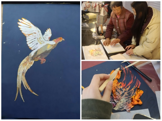 2026年1月19日至23日,依托教育与音乐学院“一站式”学生社区支持的“栖羽金窗”实践团队深入明溪紫云村,跟随县级非遗传承人罗全娣系统学习明溪紫云金箔彩画全流程技艺。团队不仅完整复现了“金碧辉映”的唐宋宫廷工艺,更以明溪生态标志“白鹇”为主题,通过野外写生将生态元素转化为金箔艺术语言,创作六幅融合传统技法与地域叙事的新作,实现“非遗+生态”的创新实践,为古老技艺注入当代生命力。