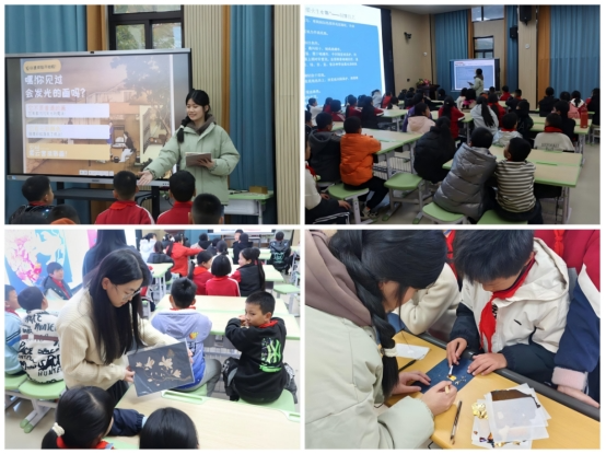 1月21日,团队将金箔彩画带入附属实验小学,设计“非遗探险之旅”课程,通过历史溯源、技艺演示、亲手贴箔等互动环节,让小学生在实践中感受传统魅力。活动不仅成为师范生教学能力的练兵场,更开发出分层课程体系与教育体验包,实践成果通过社区“文化长廊”常态化展示,形成“校内实践-社区展示-校外辐射”的良性循环。