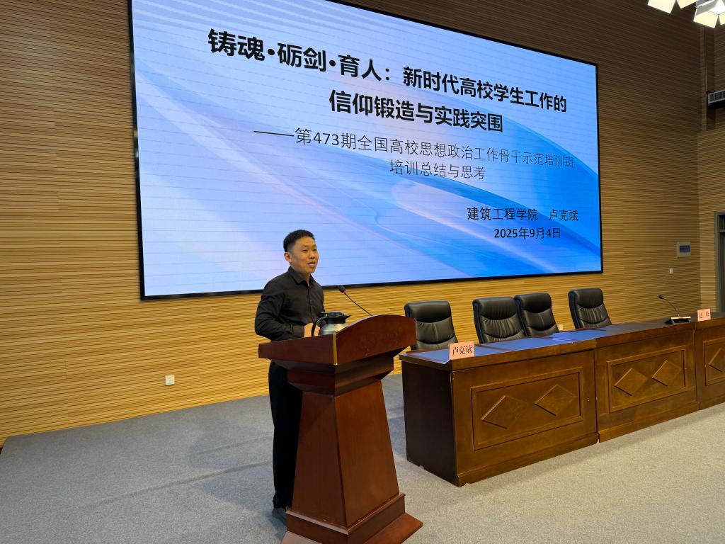 卢克斌老师以“铸魂·砺剑·育人”为主题,分享了参加第473期全国高校思想政治工作骨干示范培训班的收获。他从理论筑基、政治淬炼、思维碰撞、精神传承和育人使命五个方面,系统阐述了新时代高校学生工作的信仰锻造与实践突围。