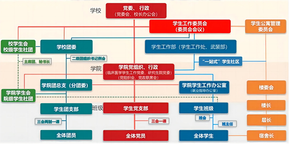 一是提高站位,汇聚力量。成立书记、校长任组长的“一站式”学生社区综合管理模式建设工作领导小组,15个职能部门协同配合,构建“三横五纵”学工育人体系。二是强化引领,筑牢根基。建立社区党支部工作联系点,优化社区党组织设置,推动功能性党支部与基层学院党组织共同建设。三是创新路径,凝聚合力。依托“辅导员发展中心”等7大平台,打造多维“党建+”品牌特色活动。深化临床医学“两段式”背景下学生党建创新工作路径,发挥中医学、蒙医药学等专业特色,实施学生社区基层党组织“双创”行动。
