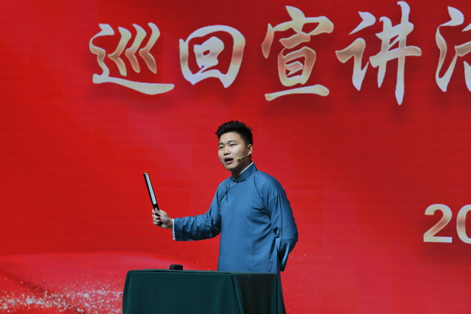整场宣讲打破传统理论传播模式,融合评书、脱口秀、相声、音乐情景剧等多元形式,让“书面语”变成“家常话”,让政策解读充满“烟火气”,赢得现场师生阵阵掌声。