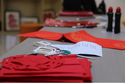 活动现场,学生工作处精心设置了多个传统文化体验区。在书法体验区,同学们挥毫泼墨,为学子们书写春联和福字,传递着新年的美好祝福。在剪窗花区,同学们为大家演示了传统剪纸的步骤,并邀请同学感受剪纸的独特魅力。此外,还有投壶、脸谱工艺品等传统文化展示,吸引了众多学生驻足观赏、学习。窗花不仅是一种装饰,更是一种艺术。同学们剪出各种美丽图案贴在窗户上,纷纷展示自己的手工技巧,为一站式学生社区增添了一抹喜庆的红色。