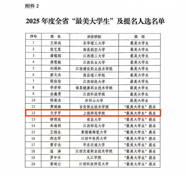 喜报!我校文宇芹同学获2025年度全省“最美大学生”提名