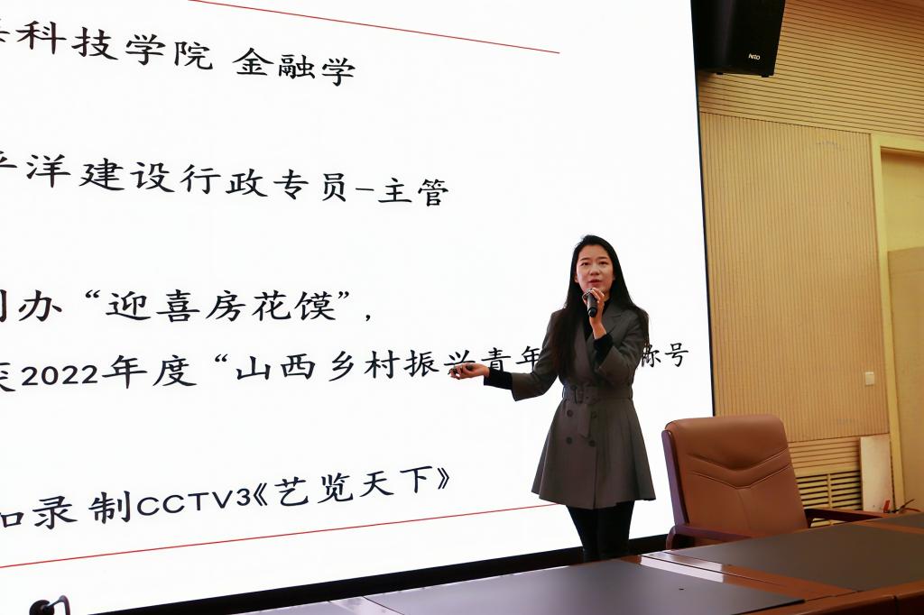 为进一步引深市校巾帼共建行动,助推市校深度融合、共赢发展,山西财贸职业技术学院妇联与晋中市妇联携手,共同开展“一月一主题”宣讲进高校活动。10月31日下午,学院特邀“山西乡村振兴青年先锋”荣誉获得者、榆次区迎喜房花馍店陈楠老师,在砺志楼大报告厅以《从大学生到650平花馍店—我的三年创业奋斗史》为题,为我院学生带来一场振奋人心的宣讲。讲座由学院妇联副主席兰杰主持。