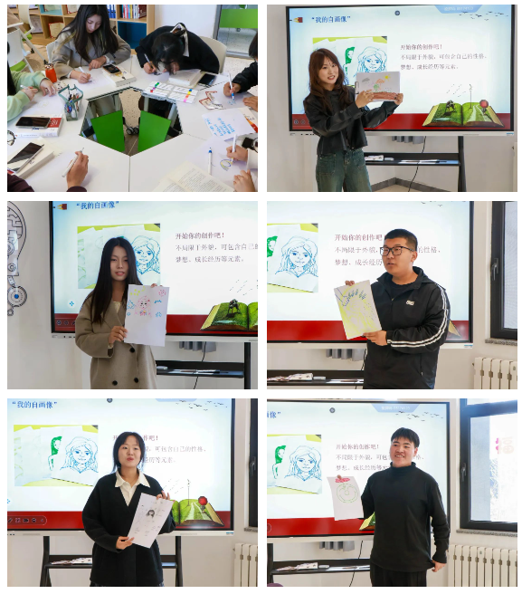 活动尾声的“我的自画像”环节,学生们纷纷拿起画笔,沉浸在创作之中,将个人成长经历、性格特质与理想愿景,巧妙融入画作,通过艺术表达重新梳理自我认知。创作过程中,有的在画中描绘与家人、朋友共度的温馨场景,来体现环境对自己性格的塑造;有的通过抽象线条表达内心的矛盾与突破。创作结束后,同学们解读分享画作背后的故事,重新梳理自我认知。在这个过程中,每个人的发言都触动着在场同学的心灵,现场气氛热烈又温馨。学生们纷纷表示,绘画过程如同一次“内心的对话”,帮助自己更清晰地看见潜藏的力量与可能性。