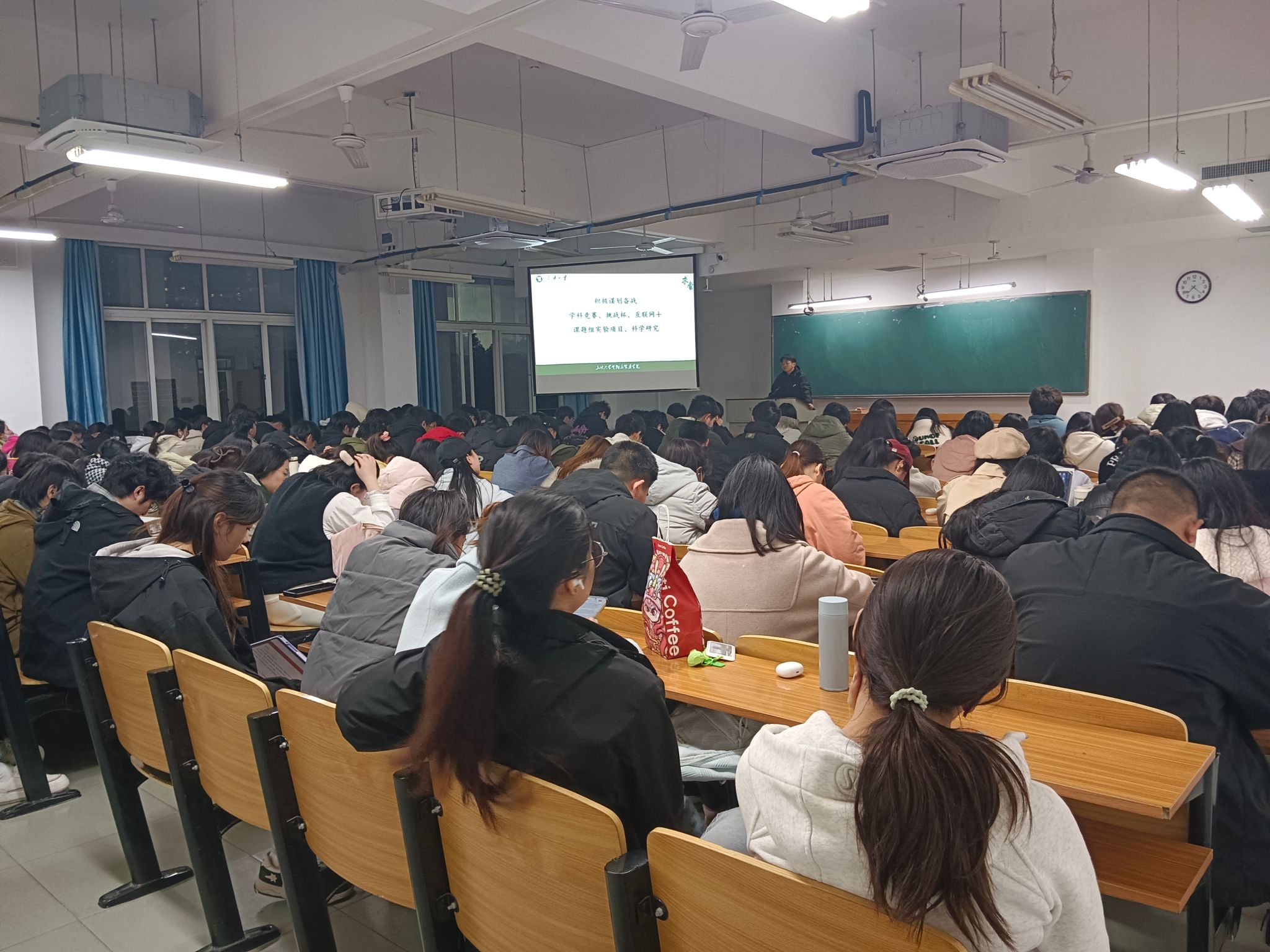在竞赛指导环节,会议重点介绍了挑战杯、国创大赛、学科竞赛等赛事对保研、就业的助力作用。通过往届获奖案例,王超鼓励学生参与科研实验,积极发挥作用,同时认真做实验,为自己的简历上增加科研的笔墨,助力以后的考研和就业。