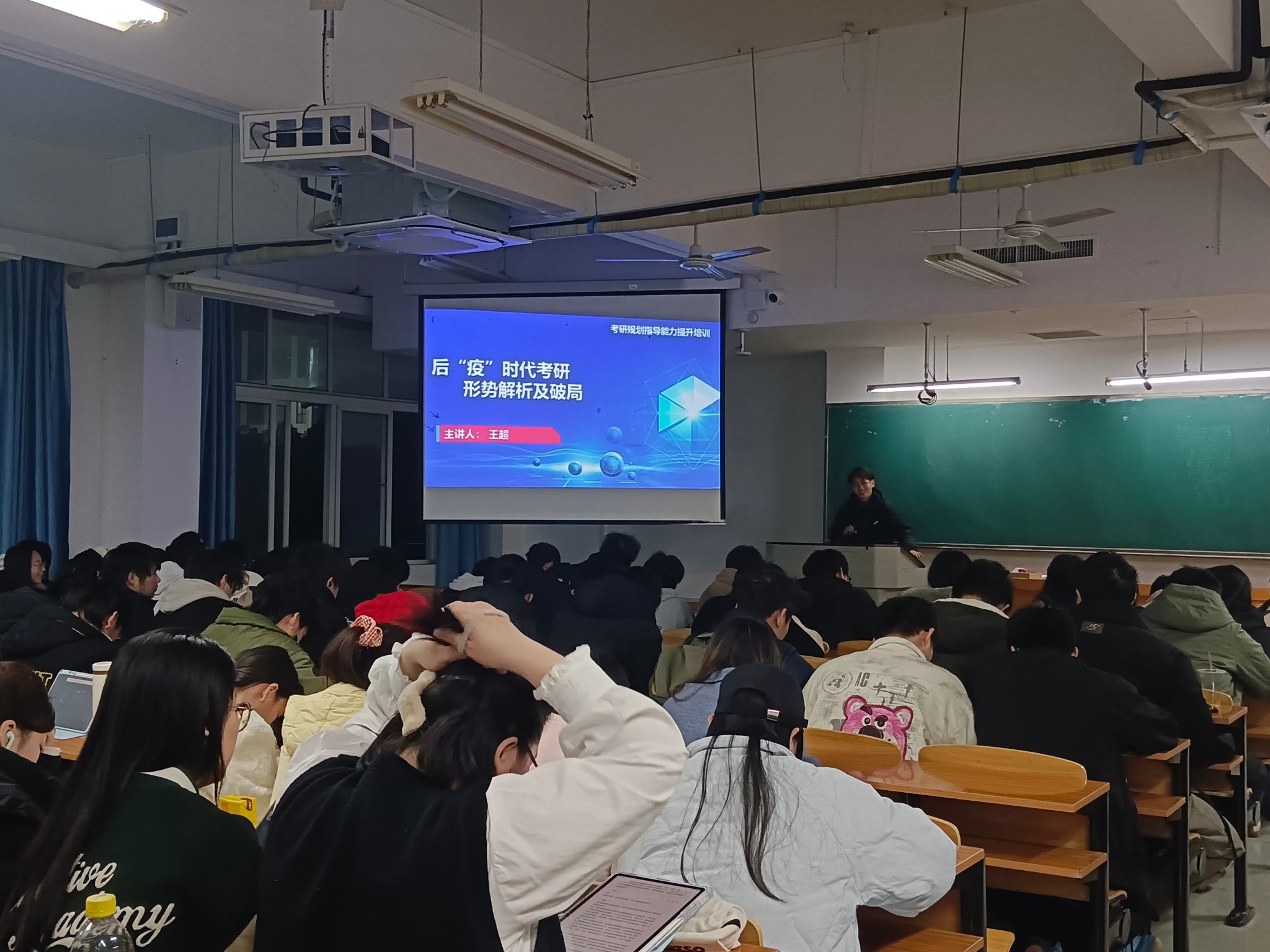 最后的问答环节中,学生就“跨专业考研难度”“竞赛与学业平衡”等问题踊跃提问。辅导员结合往届学生案例一一解答,并号召学生在一周内制定个人计划,主动预约一对一咨询。