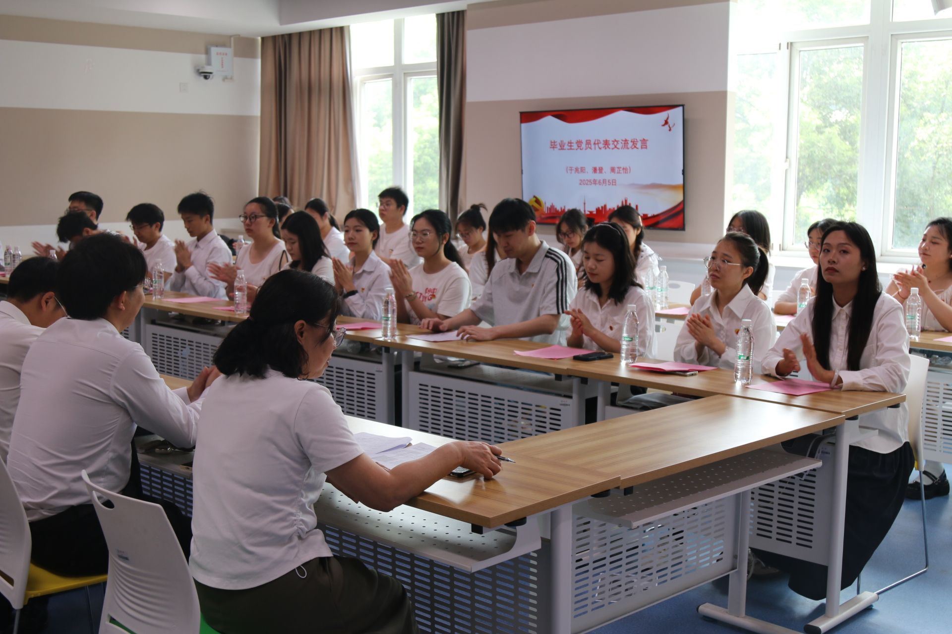 活动以在生材楼前的集体合影中拉开序幕,毕业生党员身着正装、佩戴党徽,以昂扬姿态定格青春与信仰的印记。合影后,大家来到S楼智慧教室,在主持人高鹤萍的带领下,全体党员面向党旗庄严宣誓,铿锵誓言回荡教室,唤醒入党初心。