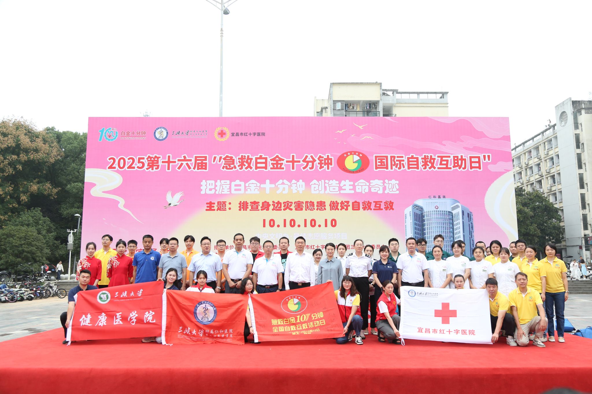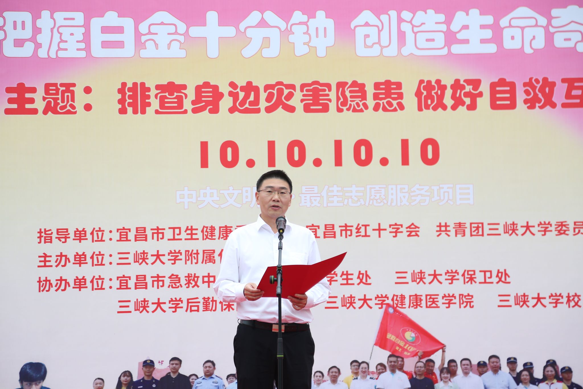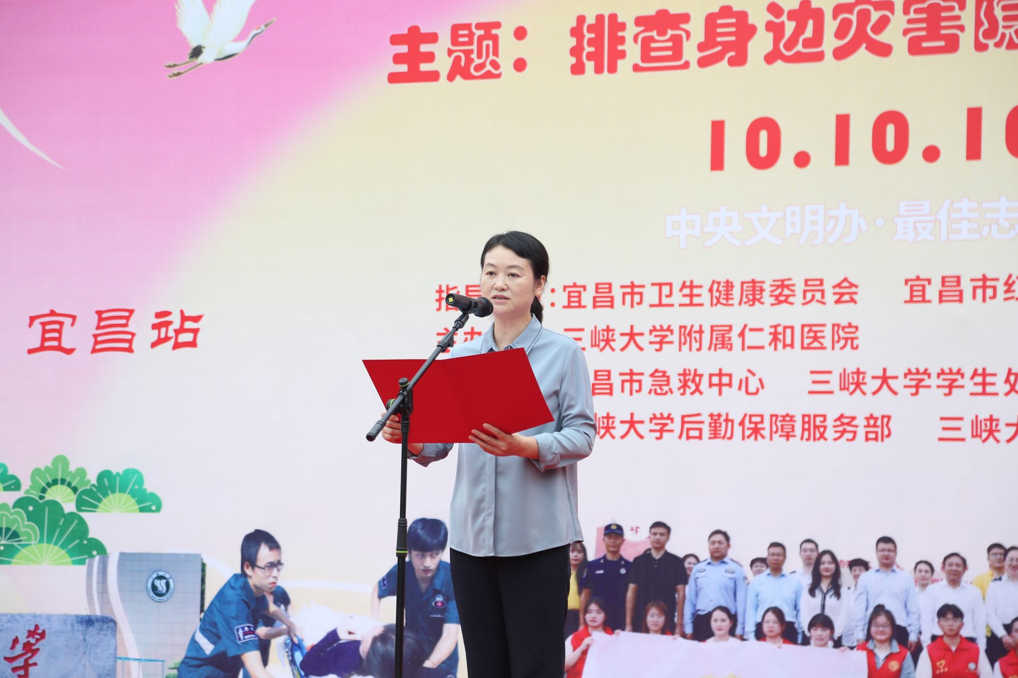10月10日上午,由我校附属仁和医院主办的第十六届“急救白金十分钟”全国自救互救志愿服务宜昌站活动在沁苑广场成功举行。活动由宜昌市卫生健康委员会、宜昌市红十字会、共青团三峡大学委员会指导,宜昌市急救中心,我校学生处、保卫处、后勤保障服务部、健康医学院、校医院等单位共同协办。宜昌市红十字会党组书记、常务副会长丁晓燕,我校党委常委、副校长张锐出席并致辞。