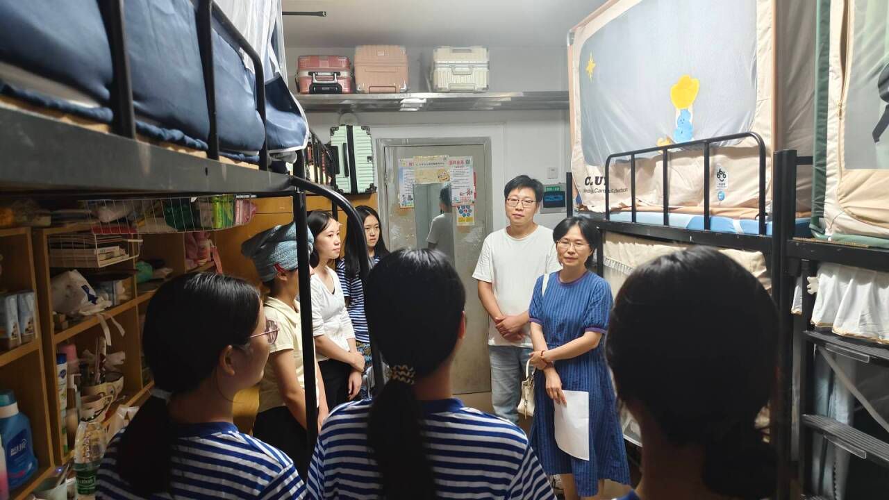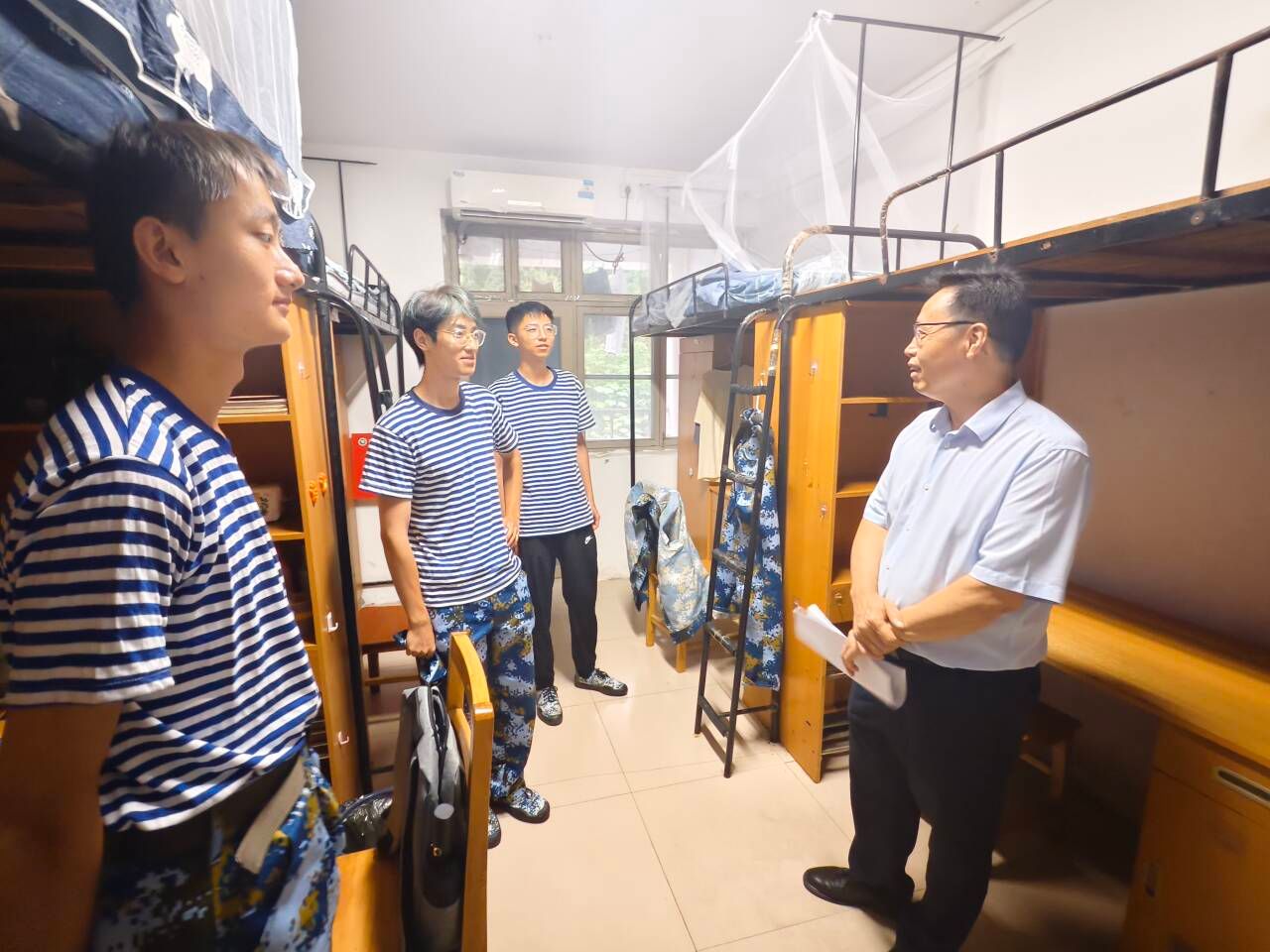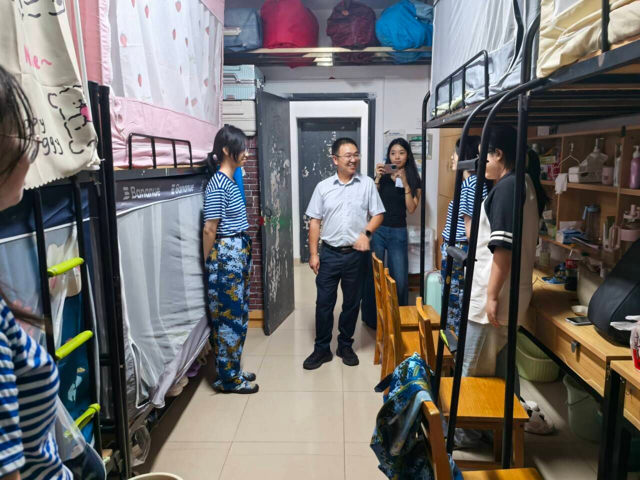 每到一间寝室,老师们都详细询问新生们的住宿环境是否习惯、饮食是否适应,同时仔细查看了寝室的床铺设施、水电供应、通风采光等情况。