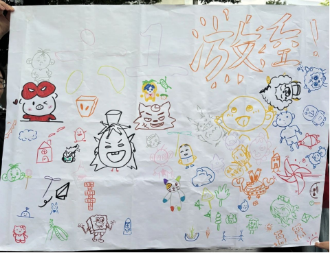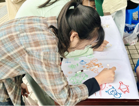 在工作人员的引导下,同学们开启了趣味盎然的“挑战”。在猜动画主题曲环节,同学们在音符跳跃中叩启童年记忆,营造出放松愉快的氛围;在百人传画环节,一人一纸一笔,纸飞机、棒棒糖、小风车等充满童趣的元素跃然纸上,充满童趣的画作带着愉快的心情传递给后续参与者;在图画捉迷藏和夹弹珠环节,需要同学们调动观察和协调能力,在简单的活动中收获快乐。