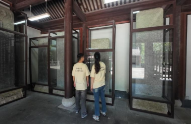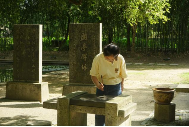 移步柯桥,实践团来到镜湖,这一泓碧水曾映照李白醉揽的明月,也荡漾过陆游晚年的深情。成员们立于湖畔,齐声诵读“唯有门前镜湖水,春风不改旧时波”。微风拂过,湖面涟漪轻漾,仿佛与千年前的诗意遥遥呼应。在若耶溪畔,浓荫蔽日,白鹭倏然掠水而飞,此情此景让成员们真切体会到王籍笔下“蝉噪林逾静”的意境。行至书法圣地兰亭,同学们效仿古人雅趣,以清流为墨,在青石上书写“畅”字,仿佛与在此挥毫的书圣王羲之,有了一次跨越时空的无声对话。
